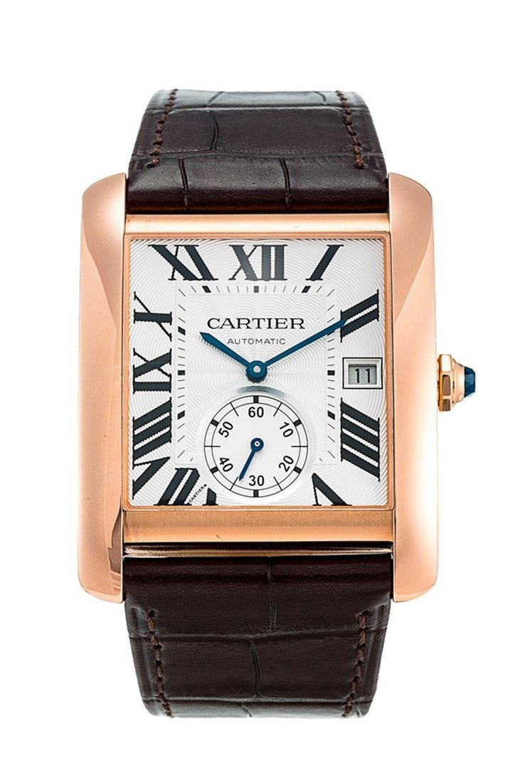 18K pink gold case with a brown alligator leather strap. Fixed bezel. Silver flinque dial with blue-tone hands and Roman numeral hour markers. Minute markers around the inner rim. Dial Type: Analog. Date display at the 3 o'clock position. 60 second sub-dial at the 6 o'clock position. Automatic mechanical movement. 1904-PS MC engine. Scratch resistant sapphire crystal. Case dimension: 34.3 mm x 44 mm. Case thickness: 9.5 mm. Rectangle case shape. Deployment clasp. Water resistant at 30 meters / 100 feet. Functions: date, hour, minute, small second. Luxury watch style. Watch label: Swiss Made. Cartier Tank MC Mechanical Silver Dial Brown Leather Strap Men's Watch W5330001
