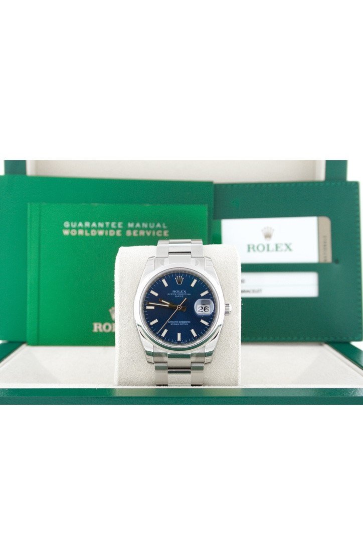 Stainless steel case with a stainless steel Rolex oyster bracelet. Fixed stainless steel bezel. Blue dial with silver-tone hands and luminous stick hour markers. Minute markers around the outer rim. Dial Type: Analog. Luminescent hands and dial markers. Date display at the 3 o'clock position. Automatic movement with a 48-hour power reserve. Scratch resistant sapphire crystal. Case diameter: 34 mm. Round case shape. Deployment clasp. Water resistant at 100 meters / 330 feet. Functions: date, hour, minute, second. Luxury watch style. Watch label: Swiss Made. Rolex Oyster Perpetual Date 34 Blue Dial Stainless Steel Rolex Oyster Automatic Men's Watch. 115200