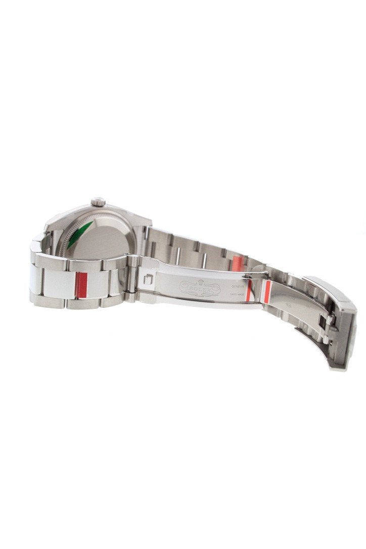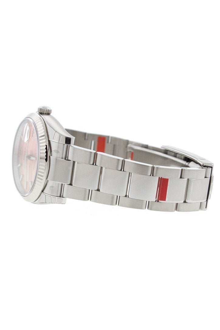 Stainless steel case with a stainless steel oyster bracelet. Fluted 18k white gold bezel. Pink dial with luminous silver tone hands and stick hour markers. Date displays at the 3 o'clock position. Self-winding movement. Scratch resistant sapphire crystal. Case diameter: 34 mm. Water resistant at 100 meters/ 330 feet. Functions: hours, minutes, seconds date. Rolex Date Pink Stick Dial 18k White Gold Fluted Bezel Oyster Bracelet Men's Watch 115234.