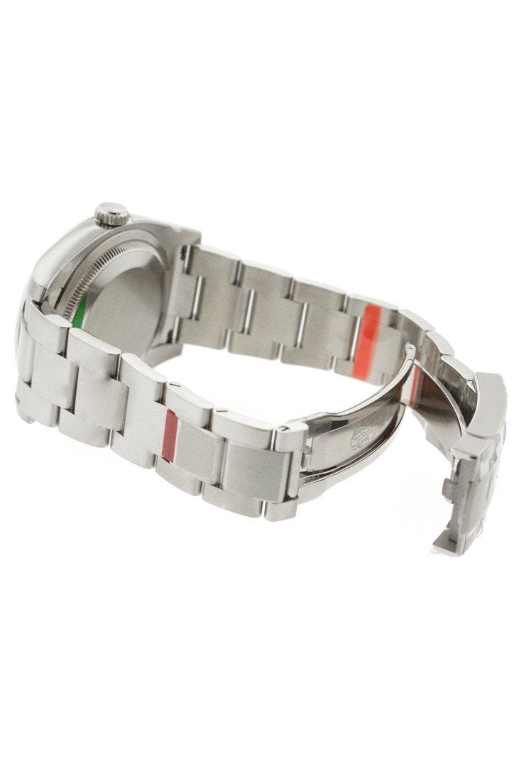 Rolex Oyster Perpetual 116000. Stainless steel case with a stainless steel bracelet. Fixed stainless steel bezel. White grape dial with silver-tone luminous hands and index hour markers. Minute markers around the outer rim. Dial Type: Analog. Luminescent hands and markers. Automatic movement. Scratch resistant sapphire crystal. Pull / push crown. Solid case back. Case diameter: 36 mm. Round case shape. Oysterclasp clasp. Water resistant at 100 meters / 330 feet. Functions: hour, minute, second. Luxury watch style. Watch label: Swiss Made. Rolex Oyster Perpetual White Grape Dial Stainless Steel Band And Case Mens Watch 116000.