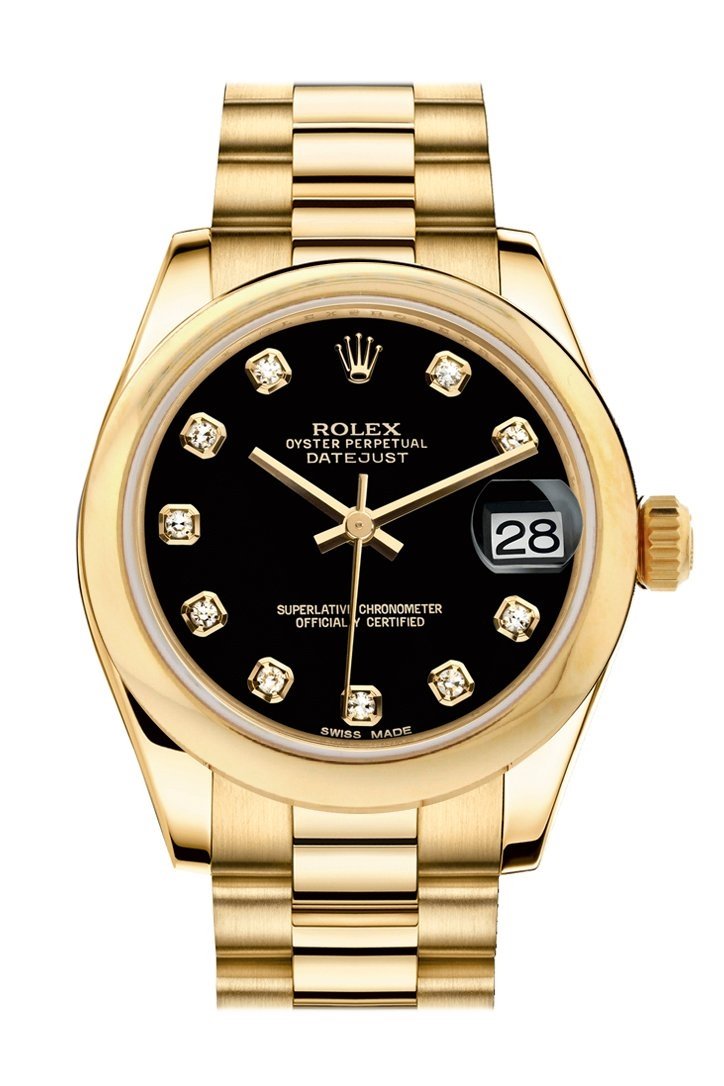 18k gold domed bezel. Black dial with Diamonds hour markers. Minute markers around the outer rim. Dial Type: analog. Date display at the 3 o'clock position. Automatic movement. Deployment clasp. Luxury watch style. Rolex Datejust Black Automatic 18K Gold Bezel Watch 178248