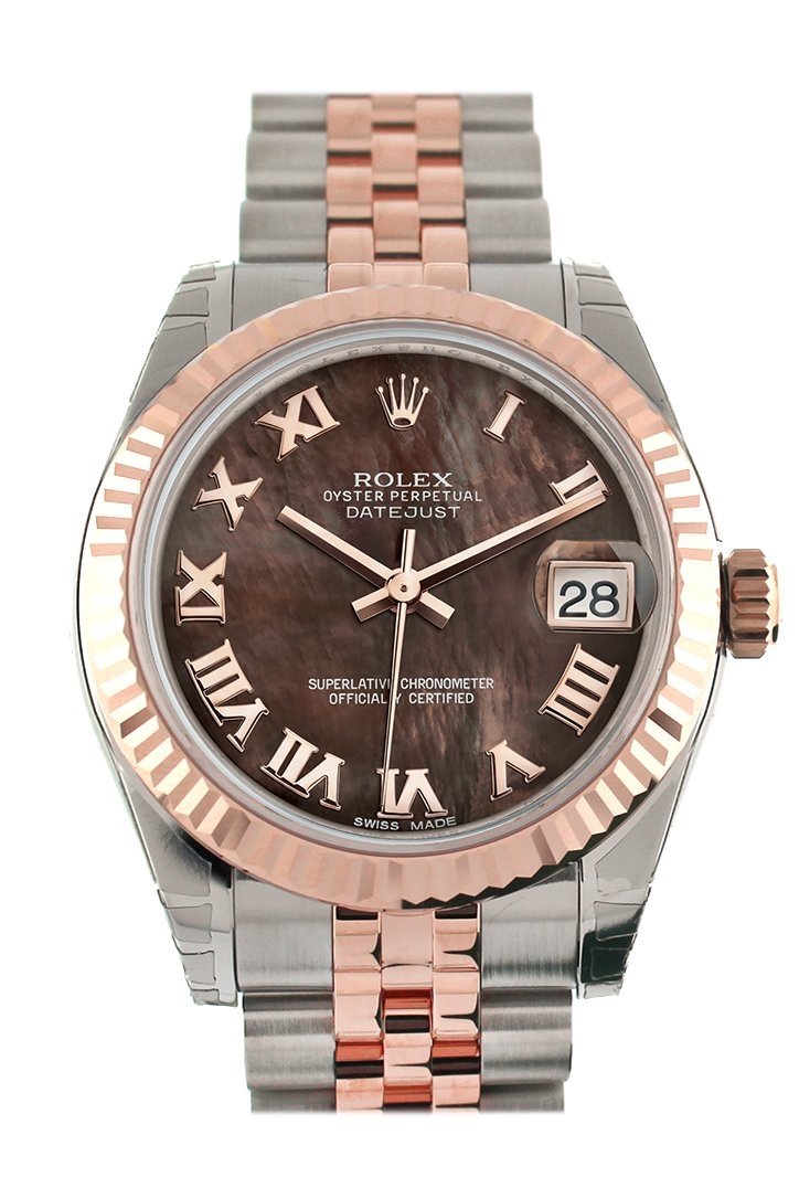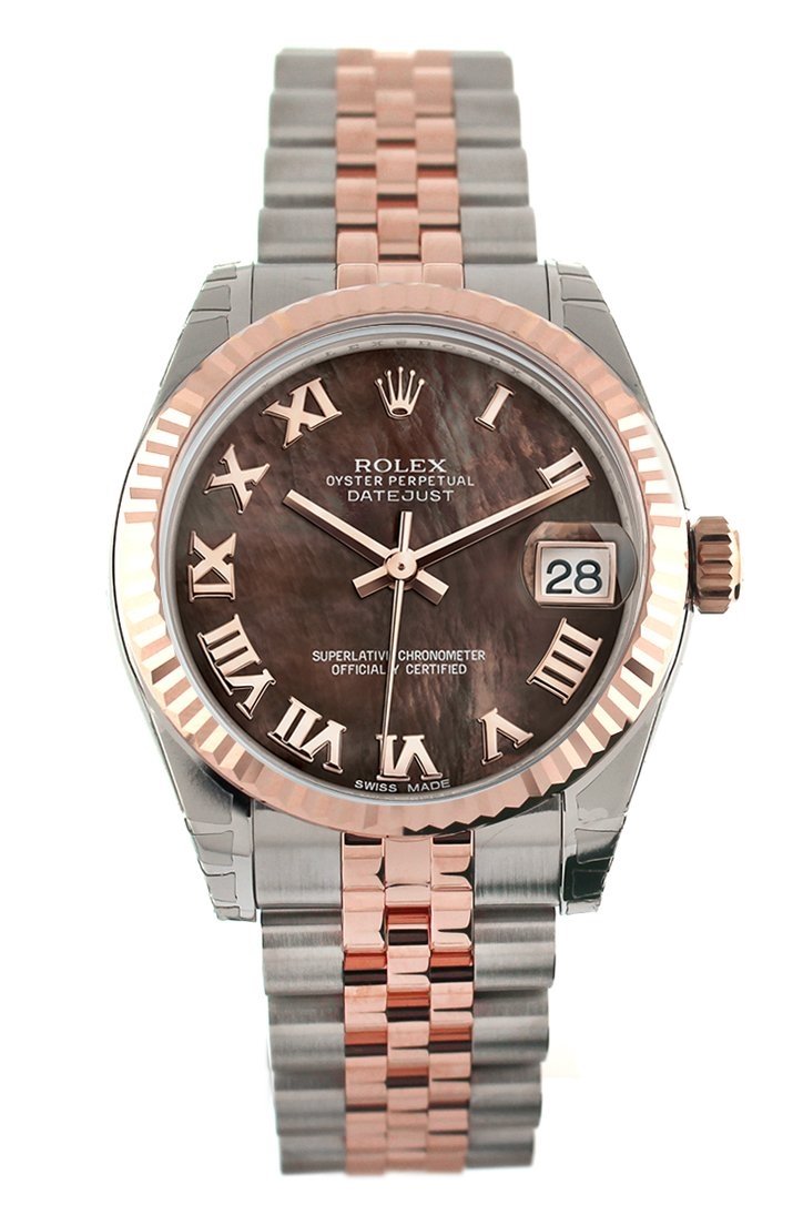 Everose gold case with a Jubilee everose gold bracelet. Fluted bezel. Black Mother Pearl dial with rose gold-tone hands and Roman hour markers. Dial Type: Analog. Date display at the 3 o'clock position. Automatic movement. 2235 engine. Scratch resistant sapphire crystal. Screw down crown. Solid case back. Case diameter: 31 mm. Round case shape. Folding oysterclasp clasp. Water resistant at 100 meters / 330 feet. Functions: date, hour, minute, second. Luxury watch style. Watch label: Swiss Made.