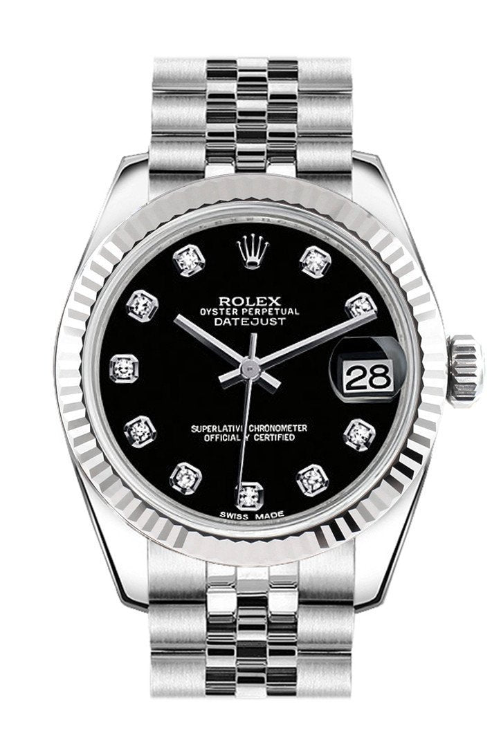 • Rolex Datejust 31 Black Set Diamonds Dial White Gold Fluted Bezel Jubilee Ladies Watch 178274