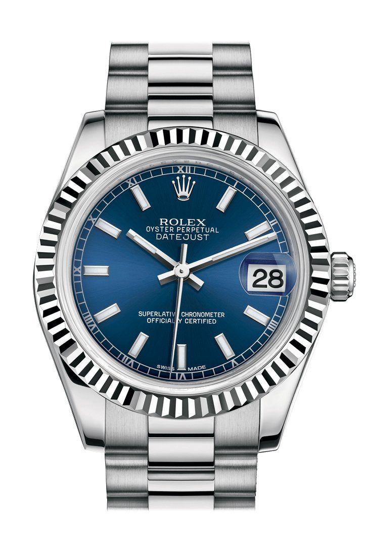 18k White gold case with a 18k White gold Rolex President bracelet. Fixed - fluted 18kWhite gold bezel. Blue dial with rose-gold tone hands and Index numeral hour markers. Dial Type: Analog. Date display at the 3 o'clock position. Automatic movement. 2235 engine. Scratch resistant sapphire crystal. Screw down crown. Solid case back. Case diameter: 31 mm. Round case shape. Concealed Crown clasp. Water resistant at 100 meters / 330 feet. Functions: date, hour, minute, second. Luxury watch style. Watch label: Swiss Made. Rolex Lady-Datejust 31 Blue Dial 18K White Gold President Automatic Ladies Watch 178279