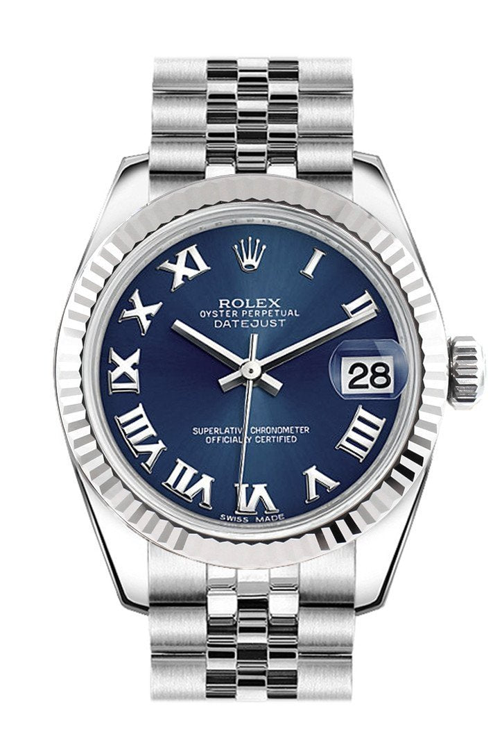 Rolex Datejust 31 Blue Roman Dial White Gold Fluted Bezel Jubilee Ladies Watch 178274