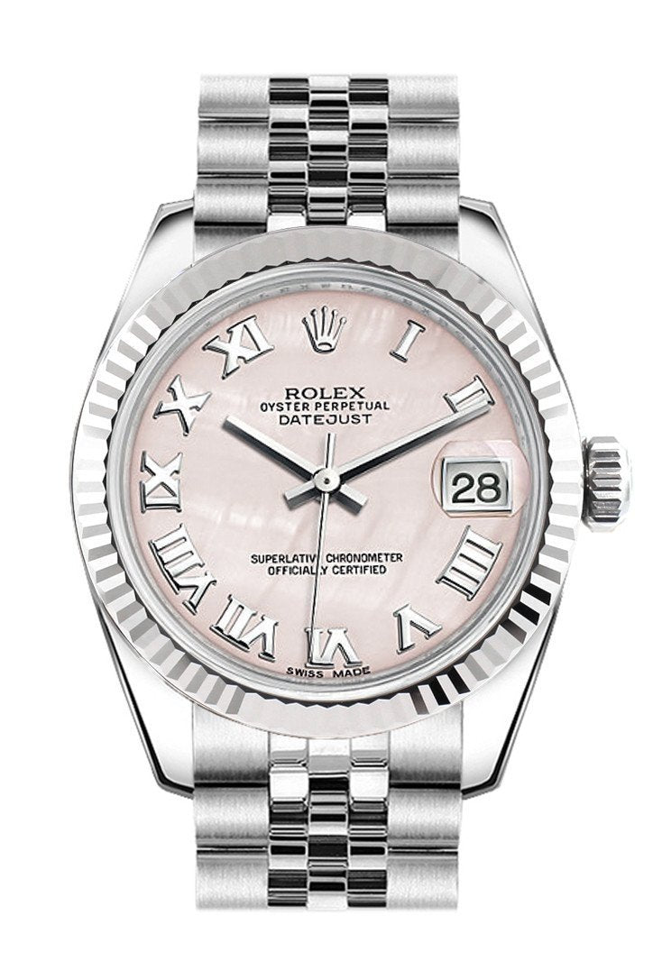 Rolex Datejust 31 Pink Mother of Pearl Roman Dial White Gold Fluted Bezel Jubilee Ladies Watch 178274