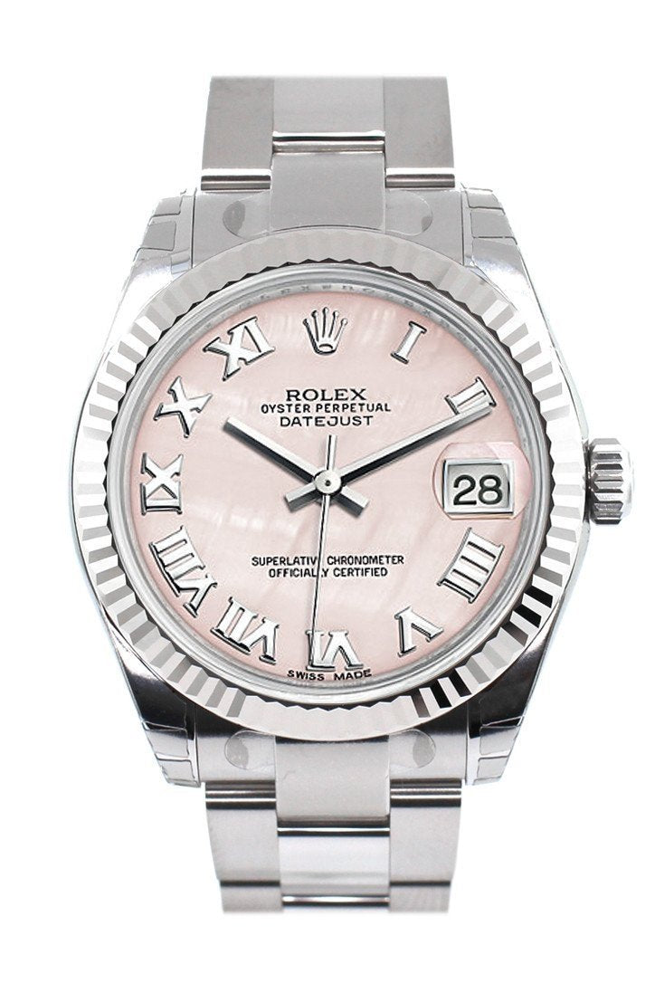Stainless steel case with a stainless steel rolex oyster bracelet. Fixed - fluted 18k white gold bezel. PinkMother of pearl dial with silver-tone hands and Roman numeral hour markers. Dial Type: Analog. Date display at the 3 o'clock position. Automatic movement. Scratch resistant sapphire crystal. Screw down crown. Case diameter: 31 mm. Round case shape. Oysterclasp clasp. Water resistant at 100 meters / 330 feet. Functions: date, hour, minute, second. Luxury watch style. Watch label: Swiss Made. Rolex Datejust Lady 31 Mother of Pearl Dial Stainless Steel Rolex Oyster Automatic Watch 178274