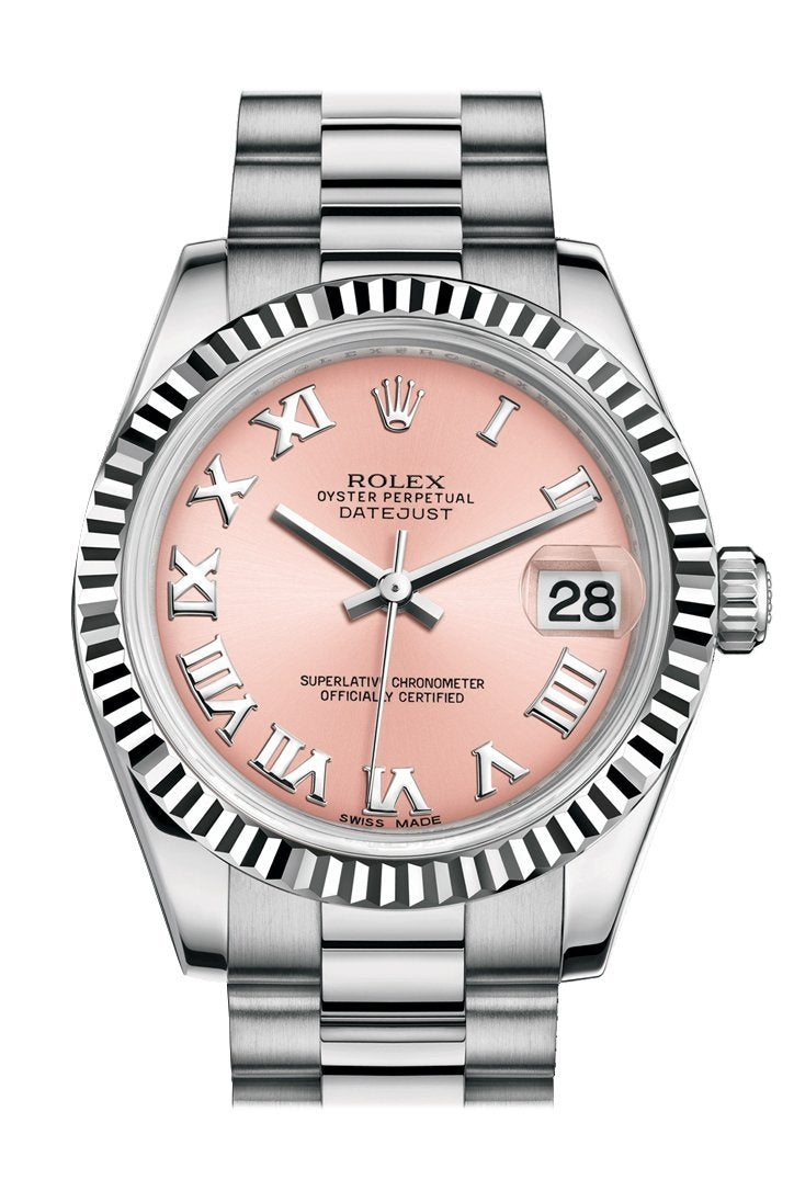 18k White gold case with a 18k White gold Rolex President bracelet. Fixed - fluted 18kWhite gold bezel. Pink dial with rose-gold tone hands and Roman numeral hour markers. Dial Type: Analog. Date display at the 3 o'clock position. Automatic movement. 2235 engine. Scratch resistant sapphire crystal. Screw down crown. Solid case back. Case diameter: 31 mm. Round case shape. Concealed Crown clasp. Water resistant at 100 meters / 330 feet. Functions: date, hour, minute, second. Luxury watch style. Watch label: Swiss Made. Rolex Lady-Datejust 31 Pink Dial 18K White Gold President Automatic Ladies Watch 178279