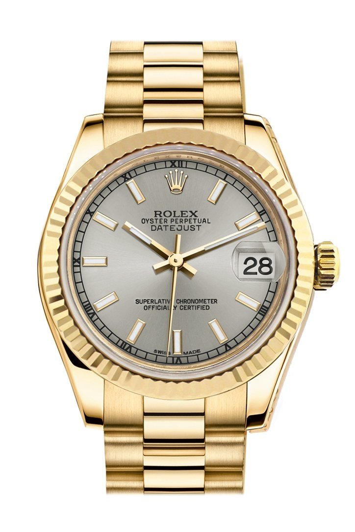18k gold Fluted bezel. Silver dial with silver hands and Index numeral hour markers. Minute markers around the outer rim. Dial Type: analog. Date display at the 3 o'clock position. Automatic movement. Deployment clasp. Luxury watch style. Rolex Datejust Silver Dial Automatic 18K Gold Bezel Watch 178278