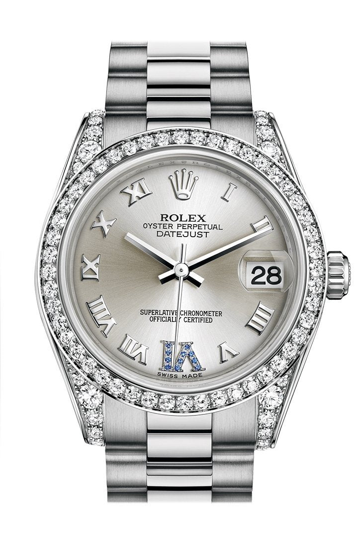 18k White gold case with a 18k White gold Rolex President bracelet. Fixed - fluted 18k White gold Diamond bezel Diamond Lugs. Silver dial with rose-gold tone hands and Large VI set with sapphires numeral hour markers. Dial Type: Analog. Purple display at the 3 o'clock position. Automatic movement. 2235 engine. Scratch resistant sapphire crystal. Screw down crown. Solid case back. Case diameter: 31 mm. Round case shape. Concealed Crown clasp. Water resistant at 100 meters / 330 feet. Functions: date, hour, minute, second. Luxury watch style. Watch label: Swiss Made. Rolex Lady-Datejust Silver Dial 18K White Gold President Automatic Ladies Watch 178159