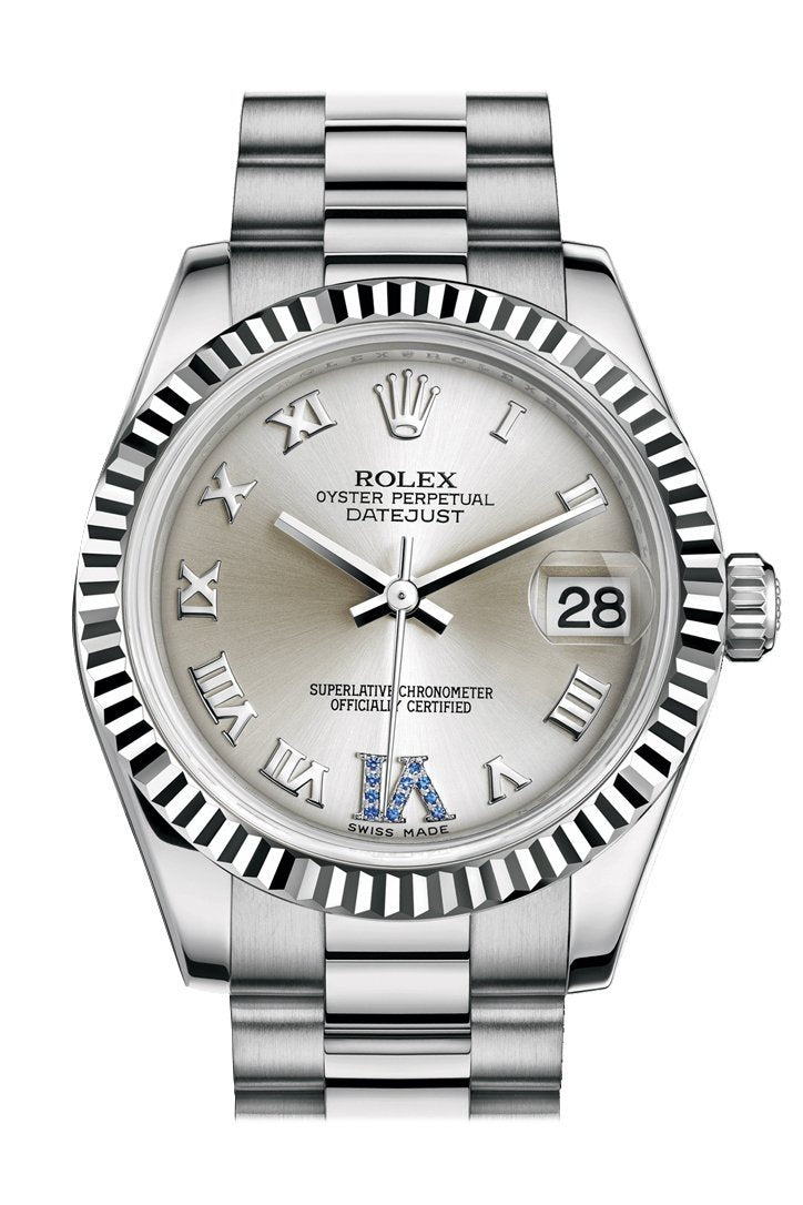 18k White gold case with a 18k White gold Rolex President bracelet. Fixed - fluted 18kWhite gold bezel. Silver dial with rose-gold tone hands and Large VI set with sapphires numeral hour markers. Dial Type: Analog. Date display at the 3 o'clock position. Automatic movement. 2235 engine. Scratch resistant sapphire crystal. Screw down crown. Solid case back. Case diameter: 31 mm. Round case shape. Concealed Crown clasp. Water resistant at 100 meters / 330 feet. Functions: date, hour, minute, second. Luxury watch style. Watch label: Swiss Made. Rolex Lady-Datejust 31 Silver Dial 18K Pink Gold President Automatic Ladies Watch 178279