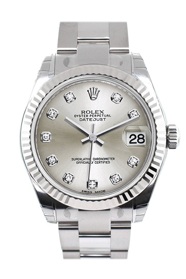 Stainless steel case with a stainless steel bracelet. Fluted bezel. Silver dial with silver-tone hands and diamond hour markers. Dial Type: Analog. Date display at the 3 o'clock position. Automatic movement. Scratch resistant sapphire crystal. Screw down crown. Case diameter: 31 mm. Oysterclasp clasp. Water resistant at 100 meters / 330 feet. Functions: date, hour, minute, second. Casual watch style. Watch label: Swiss Made. Rolex Datejust Silver Dial Automatic White Gold Bezel Steel Ladies Watch 178274