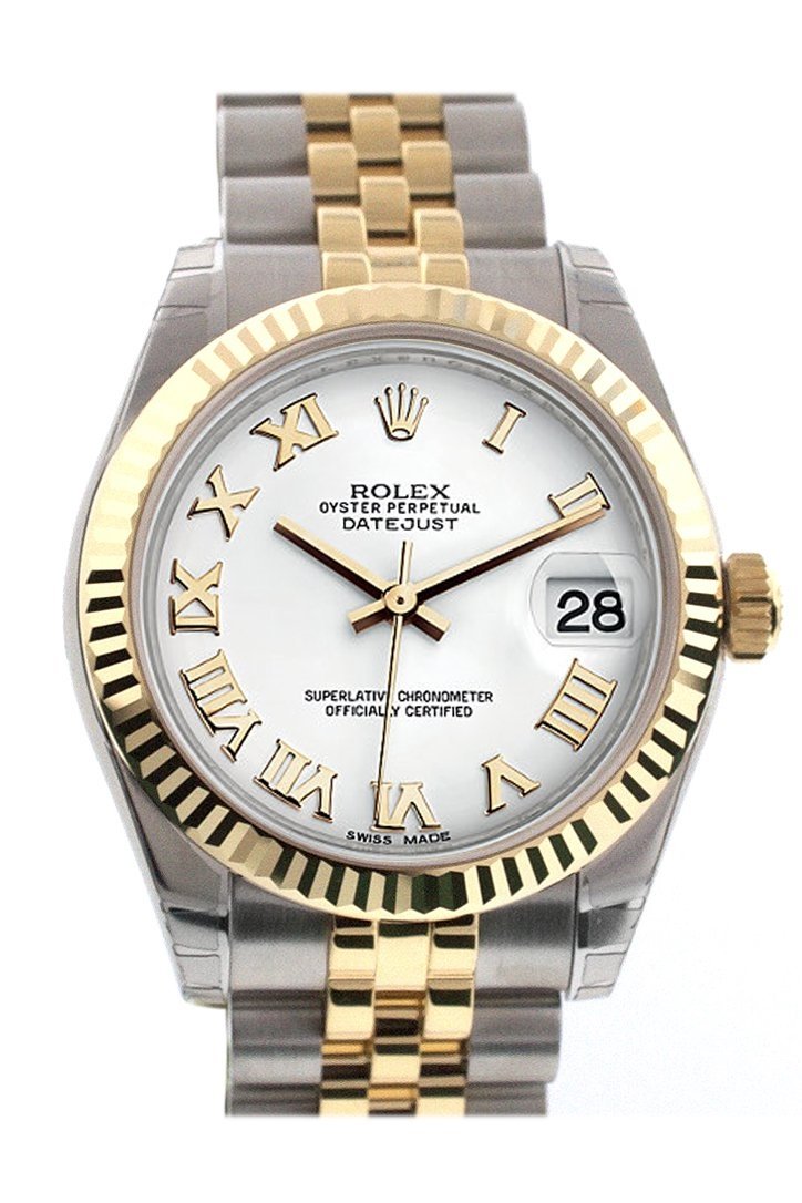 Stainless steel and 18kt gold case with a stainless steel and 18kt gold bracelet. Fluted bezel. White dial with gold-tone hands and Roman hour markers. Minute markers around the outer rim. Dial Type: Analog. Luminescent hands and markers. Date display at the 3 o'clock position. Automatic movement. Scratch resistant sapphire crystal. Screw down crown. Solid case back. Case diameter: 31 mm. Concealed crown clasp. Water resistant at 100 meters / 330 feet. Functions: hours, minutes, seconds and date. Luxury watch style. Watch label: Swiss Made.
