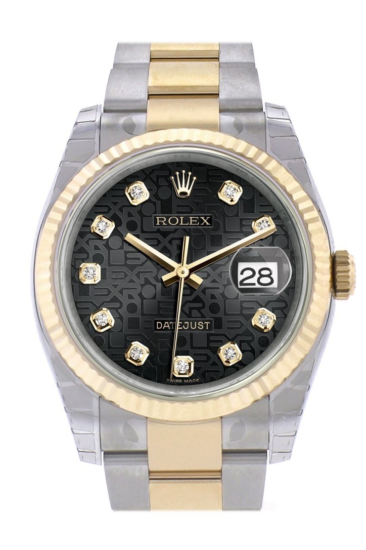 Stainless steel case with a stainless steel Rolex oyster bracelet with 18kt yellow gold center links. Fixed fluted18kt yellow gold bezel. Black Jubilee dial with yellow gold hands and Diamond numeral hour markers. Dial Type: Analog. Date display at the 3 o'clock position. Rolex calibre 3135 automatic movement with a 50-hour power reserve. Scratch resistant sapphire crystal. Screw down crown. Solid case back. Case size: 36 mm. Round case shape. Oysterlock clasp. Water resistant at 100 meters / 330 feet. Functions: date, hour, minute, second. Luxury watch style. Watch label: Swiss Made. Rolex Datejust 36 Black Jubilee Dial Stainless Steel and 18K Yellow Gold Rolex Oyster Automatic Mens Watch 116233
