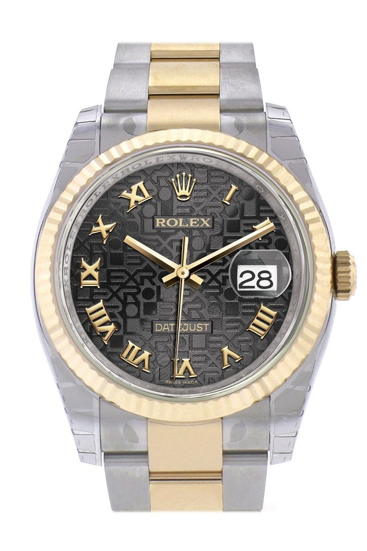 Stainless steel case with a stainless steel Rolex oyster bracelet with 18kt yellow gold center links. Fixed fluted18kt yellow gold bezel. Black dial with yellow gold hands and Roman numeral hour markers. Dial Type: Analog. Date display at the 3 o'clock position. Rolex calibre 3135 automatic movement with a 50-hour power reserve. Scratch resistant sapphire crystal. Screw down crown. Solid case back. Case size: 36 mm. Round case shape. Oysterlock clasp. Water resistant at 100 meters / 330 feet. Functions: date, hour, minute, second. Luxury watch style. Watch label: Swiss Made. Rolex Datejust 36 Black Jubilee Dial Stainless Steel and 18K Yellow Gold Rolex Oyster Automatic Mens Watch 116233