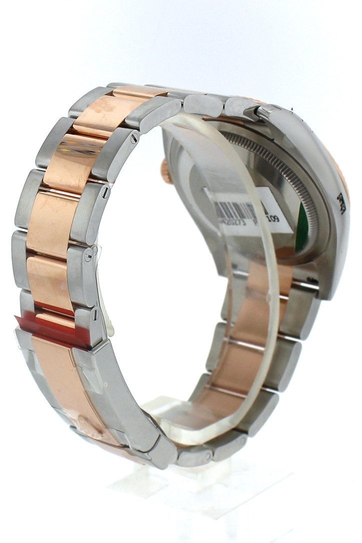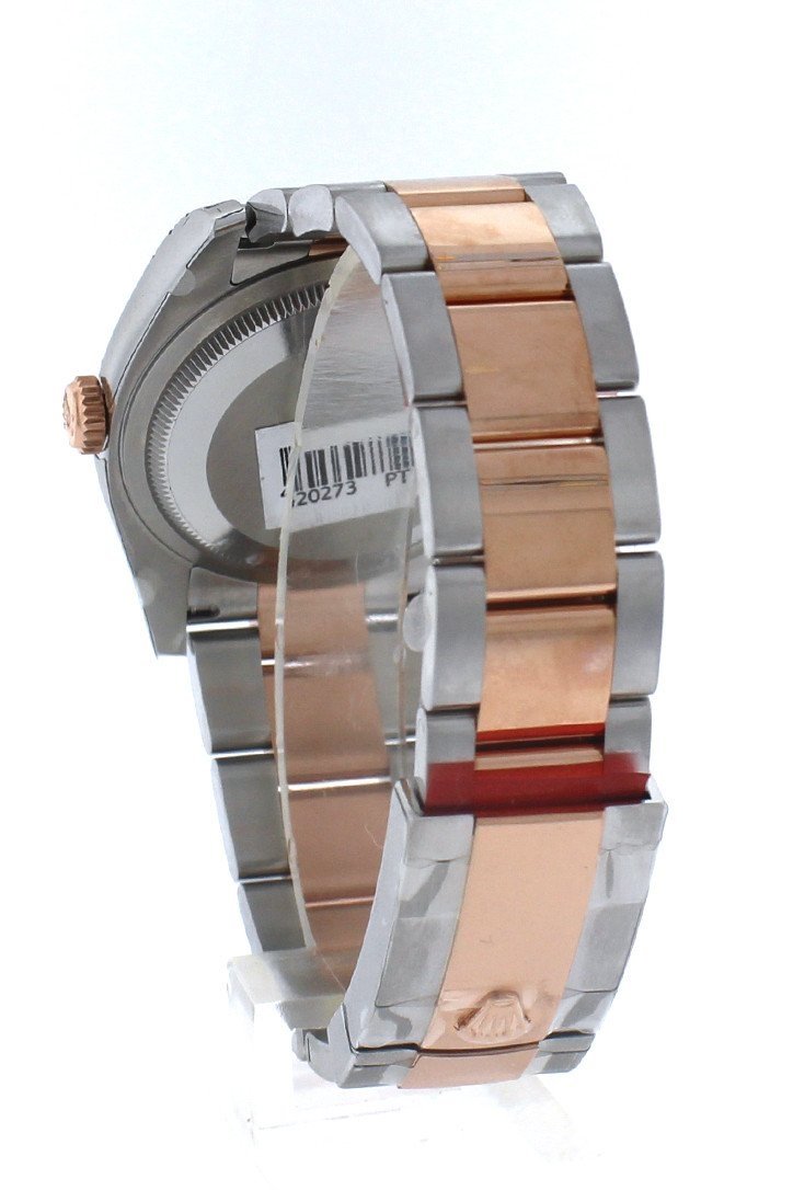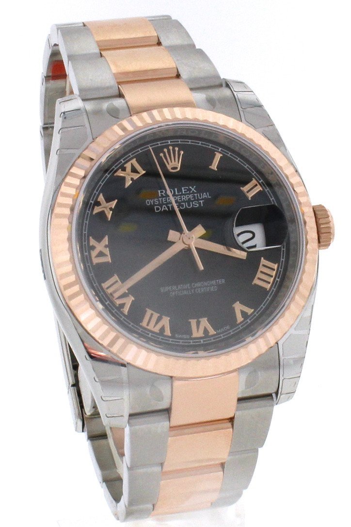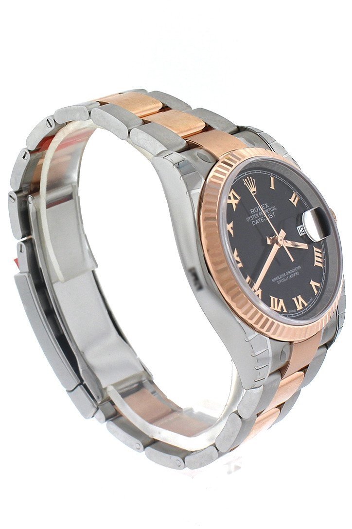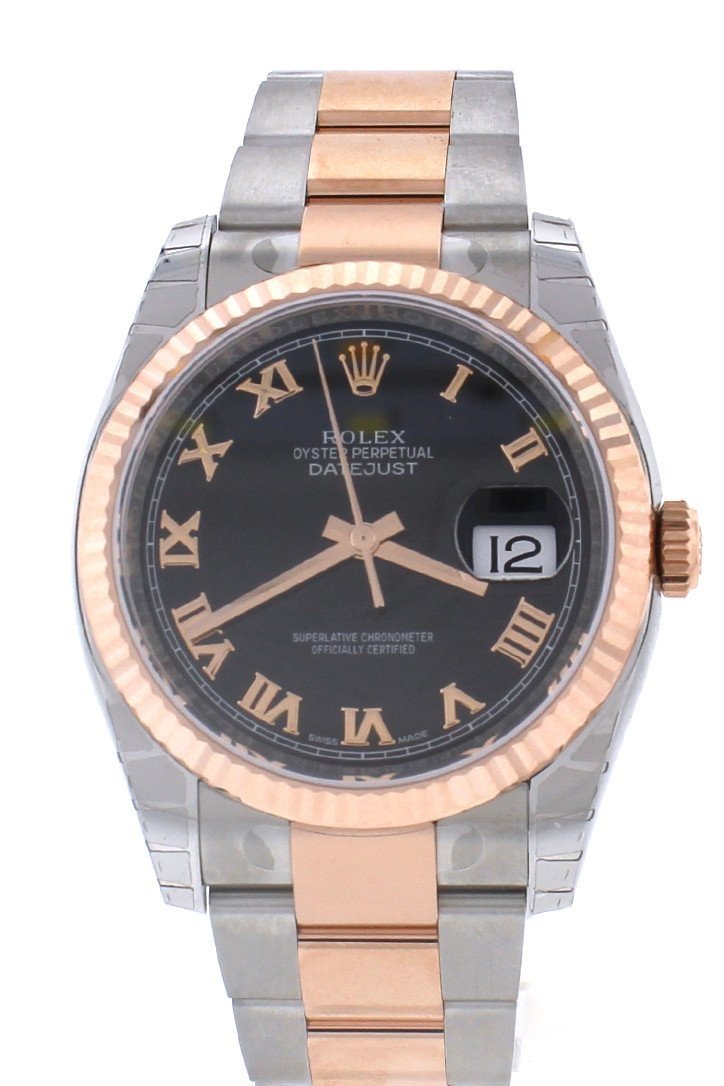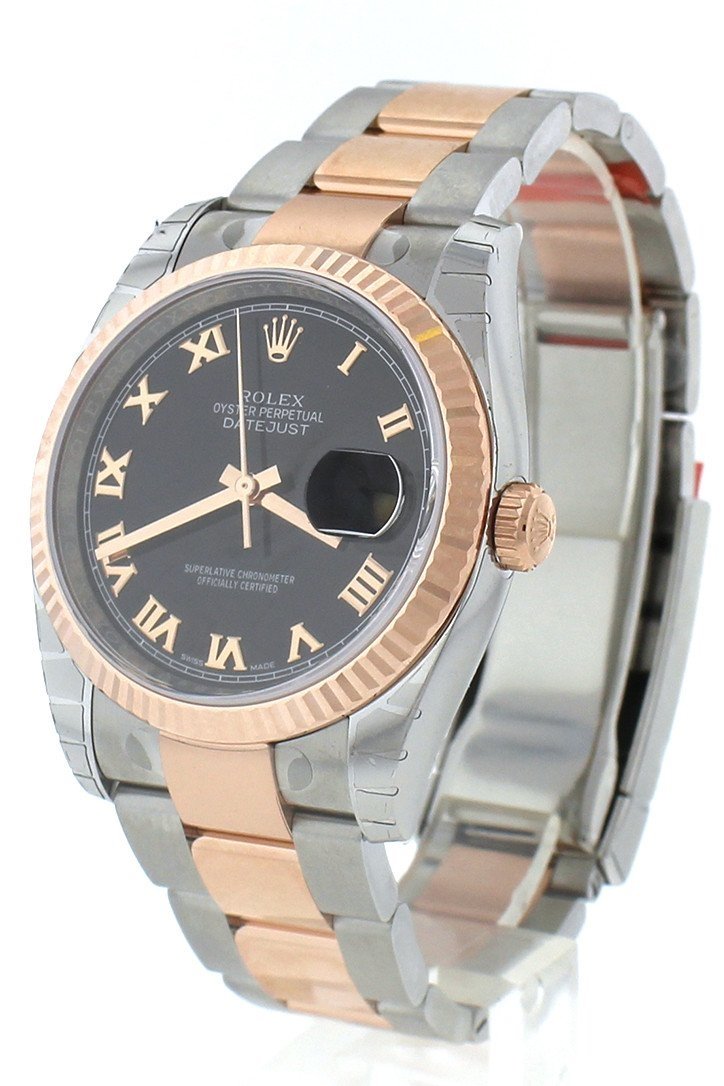 Stainless steel case with a stainless steel Rolex Oyster bracelet with 18kt everose gold center links. Fixed fluted 18kt everose gold bezel. Black dial with rose gold-tone hands and Roman numeral hour markers. Minute markers around the outer rim. Dial Type: Analog. Date display at the 3 o'clock position. Rolex calibre 3135 automatic movement with a 50-hour power reserve. Scratch resistant sapphire crystal. Screw down crown. Solid case back. Case size: 36 mm. Round case shape. Oysterlock clasp. Water resistant at 100 meters / 330 feet. Functions: date, hour, minute, second. Luxury watch style. Watch label: Swiss Made. Rolex Oyster Perpetual Datejust 36 Black Dial Stainless Steel and 18K Everose Gold Rolex Oyster Automatic Men's Watch 116231