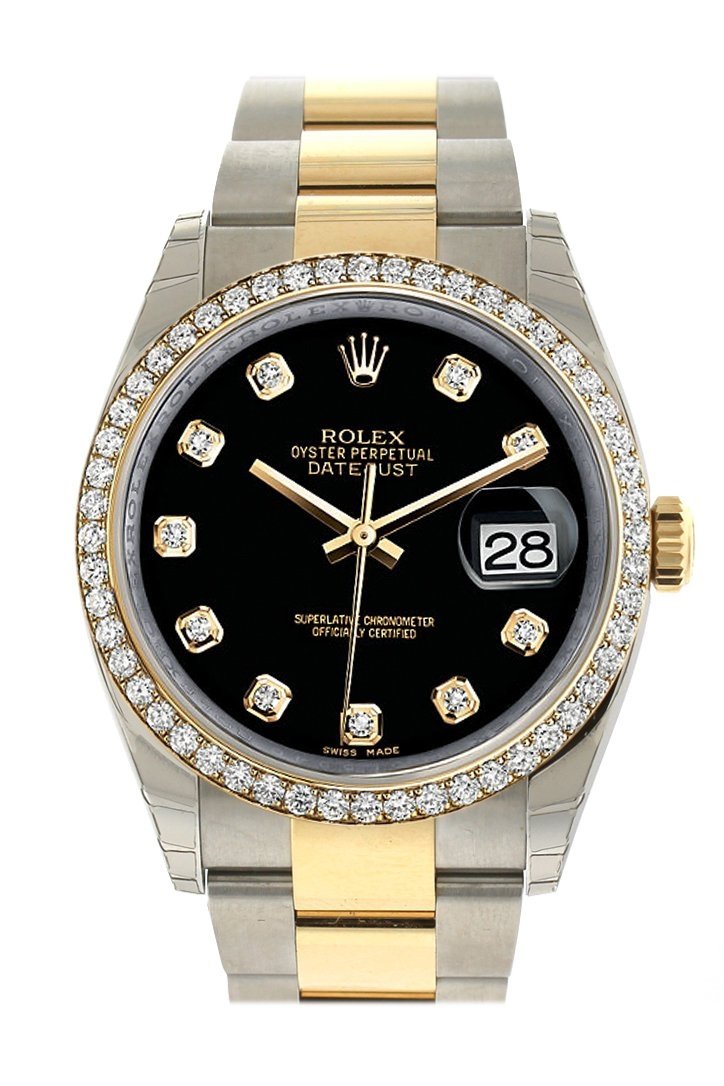 Stainless steel and 18kt yellow gold case with a stainless steel and 18kt yellow gold bracelet. Diamond bezel. Black dial with yellow-gold tone hands and diamond hour markers. Dial Type: Analog. Date display at the 3 o'clock position. Automatic movement. Scratch resistant sapphire crystal. Screw down crown. Solid case back. Case diameter: 36 mm. Oysterclasp clasp. Water resistant at 100 meters / 330 feet. Functions: hours, minutes, seconds, date. Luxury watch style. Watch label: Swiss Made. Rolex Datejust Black Dial Automatic Stainless Steel and 18kt Yellow Gold Ladies Watch 116243
