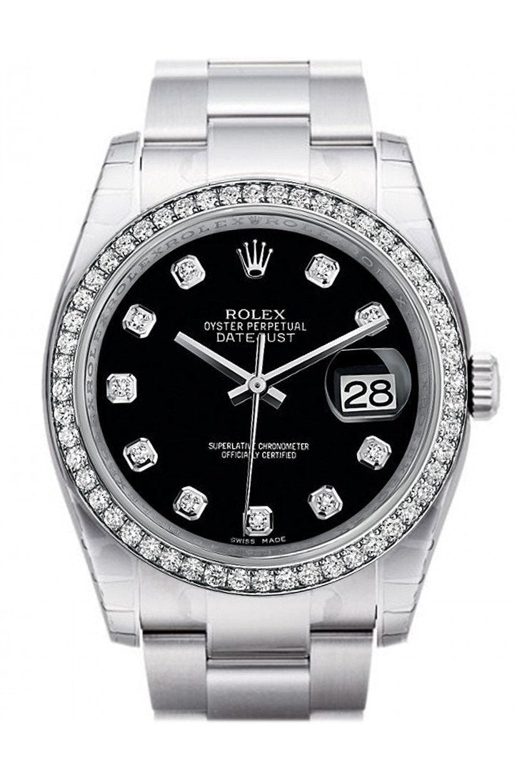 Stainless steel case with a stainless steel jubilee bracelet. Diamond bezel. Black dial with silver-tone hands and diamond hour markers. Dial Type: Analog. Date display at the 3 o'clock position. Automatic movement. Scratch resistant sapphire crystal. Screw down crown. Case diameter: 36 mm. Concealed crown clasp. Water resistant at 100 meters / 330 feet. Functions: hours, minutes, seconds, date. Luxury watch style. Watch label: Swiss Made. Rolex Black Dial Diamond Bezel Automatic Steel Ladies Watch. 116244
