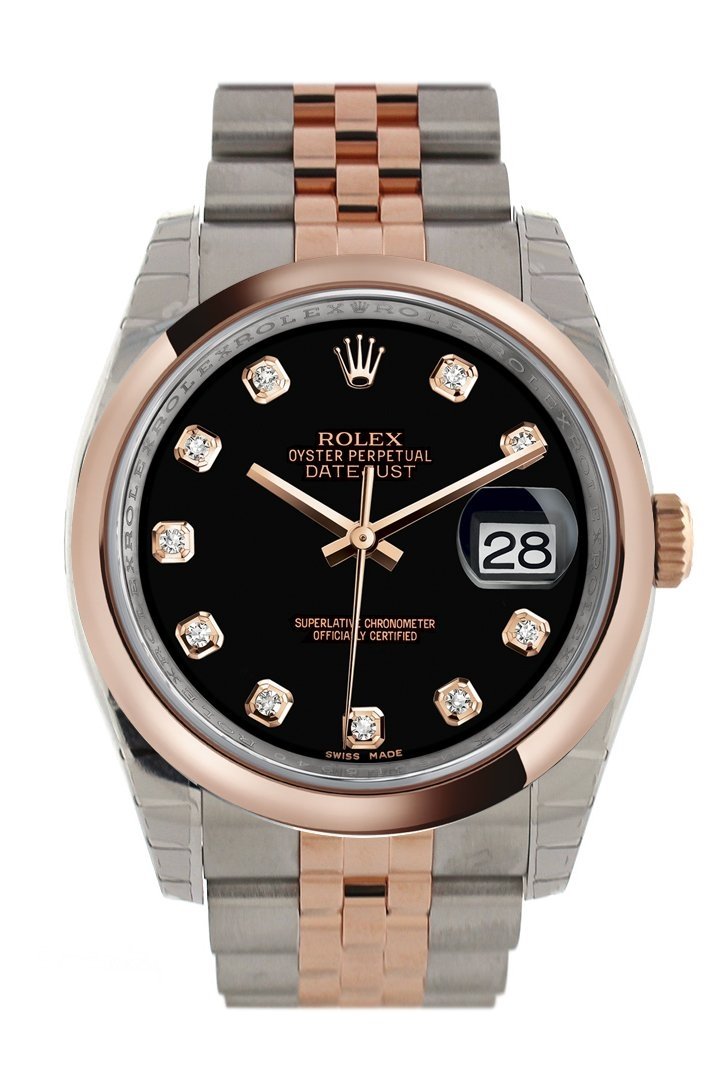 Stainless steel case with a stainless steel Rolex Jubilee bracelet with 18kt everose gold center links. Fixed Dome 18kt everose gold bezel. Black dial with rose gold-tone hands and diamonds  numeral hour markers. Minute markers around the outer rim. Dial Type: Analog. Date display at the 3 o'clock position. Rolex calibre 3135 automatic movement with a 50-hour power reserve. Scratch resistant sapphire crystal. Screw down crown. Solid case back. Case size: 36 mm. Round case shape. Oysterlock clasp. Water resistant at 100 meters / 330 feet. Functions: date, hour, minute, second. Luxury watch style. Watch label: Swiss Made. Rolex Oyster Perpetual Datejust 36 Black Dial Stainless White and 18K Everose Gold Rolex Jubilee Automatic Men's Watch 116201