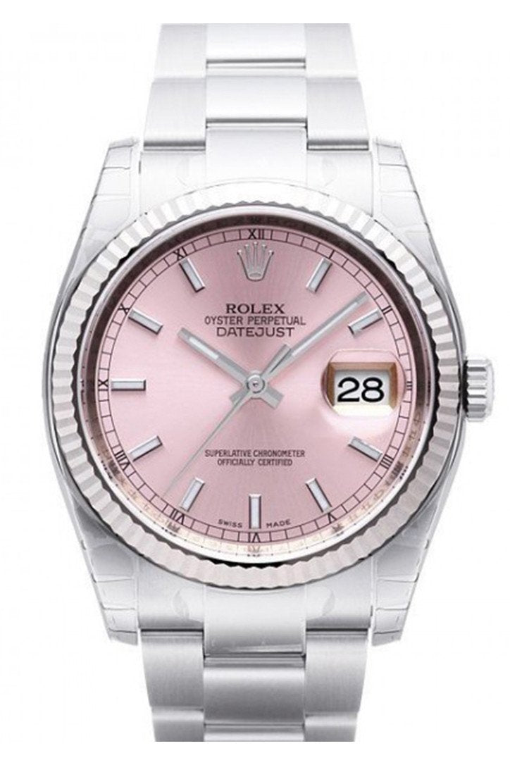 Stainless steel case with a stainless steel rolex oyster bracelet. Fixed - fluted 18k white gold bezel.  Pink dial with silver-tone hands and index hour markers. Minute markers. Dial Type: Analog. Luminescent hands and markers. Date display at the 3 o'clock position. Automatic movement. Scratch resistant sapphire crystal. Case diameter: 36 mm. Round case shape. Deployment clasp. Water resistant at 100 meters / 330 feet. Functions: date, hour, minute, second. Luxury watch style. Watch label: Swiss Made. rolex Oyster Perpetual 36 mm  Pink Dial Stainless Steel Rolex Oyster Automatic Mens Watch 116234