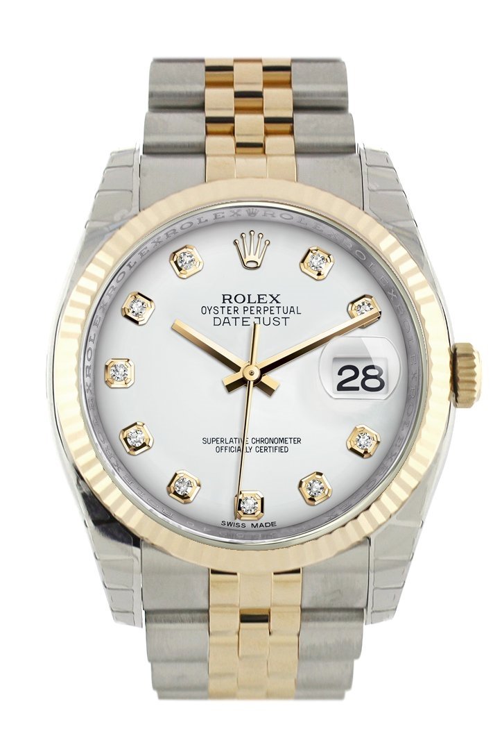 Stainless steel case with a stainless steel Rolex jubilee bracelet with 18kt yellow gold center links. Fixed fluted 18kt yellow gold bezel. White Diamond dial with yellow gold-tone hands and Romannumeral hour markers. Dial Type: Analog. Date display at the 3 o'clock position. Rolex calibre 3135 automatic movement with a 50-hour power reserve. Scratch resistant sapphire crystal. Screw down crown. Solid case back. Case size: 36 mm. Round case shape. Hidden deployment clasp. Water resistant at 100 meters / 330 feet. Functions: date, hour, minute, second, chronometer. Additional Info: date displays at 3 o'clock position. Luxury watch style. Watch label: Swiss Made. Item Variations: 116233, 116233-BKJRJ, Rolex-116233, Rolex-116233-BKJRJ. Rolex Oyster Perpetual Datejust 36 White Diamond Dial Stainless Steel and 18K Yellow Gold Jubilee Bracelet Automatic Mens Watch 116233