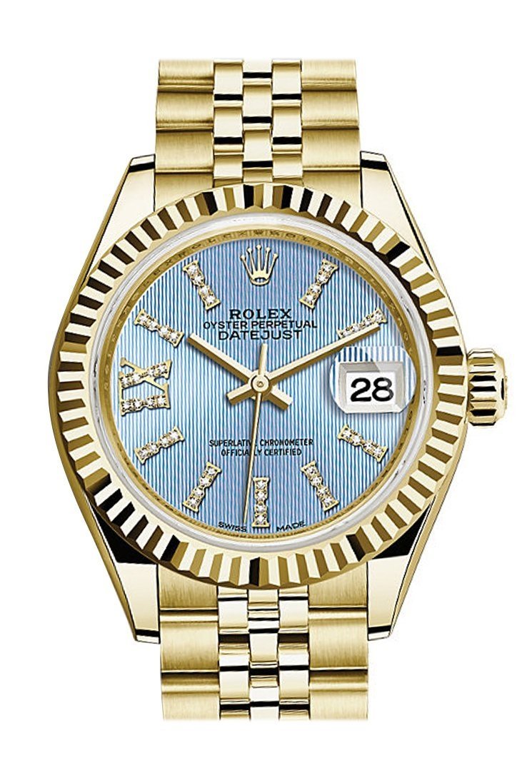 18K yellow gold oyster case with a gold rolex Jubilee bracelet. fluted bezel. Cornlower blue dial with silver-tone hands and 8 diamond set in Roman numeral IX hour markers. Dial Type: Analog. Date display at the 3 o'clock position. Rolex Calibre 2236 automatic movement. Scratch resistant sapphire crystal. Screw down crown. Solid case back. Case size: 28 mm. Round case shape. Water resistant at 100 meters / 330 feet. Functions: date, hour, minute, second. Luxury watch style. Watch label: Swiss Made. Rolex Lady-Datejust Cornlower blue Dial Automatic Ladies President Watch 279178