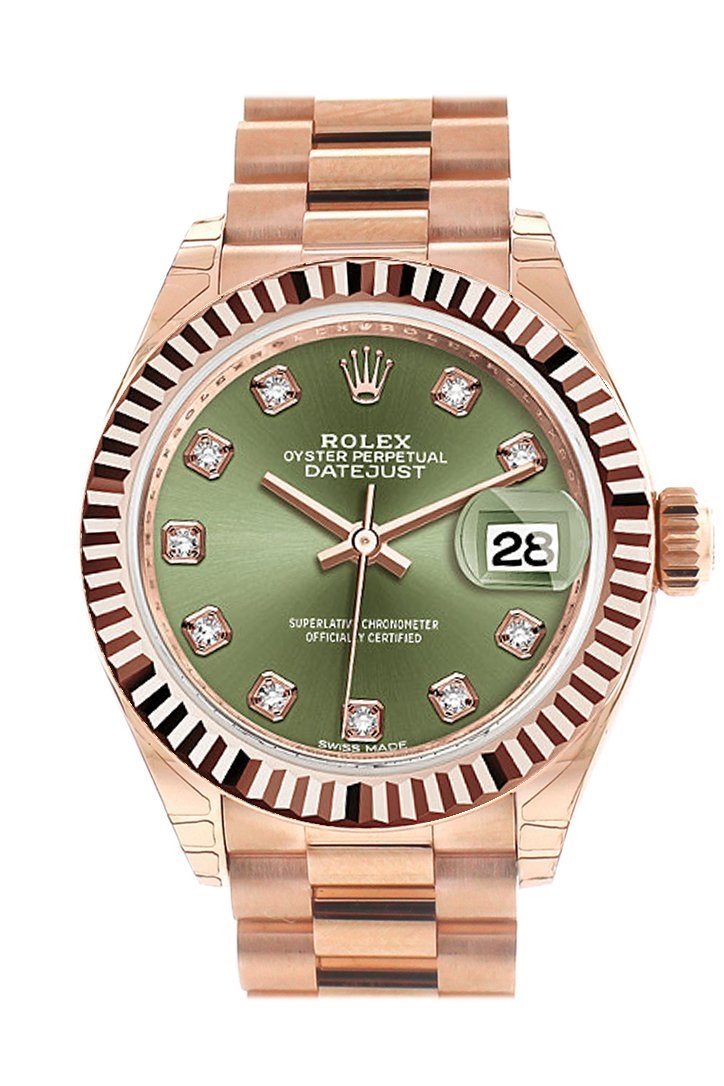 18k everose gold case with a 18k everose gold Rolex Jubilee bracelet. Fixed - Fluted 18k everose gold bezel. Olive Green dial with rose-gold tone hands and Diamond hour markers. Minute markers around the outer rim. Dial Type: Analog. Date display at the 3 o'clock position. Automatic movement. Scratch resistant sapphire crystal. Screw down crown. Solid case back. Case diameter: 28 mm. Round case shape. Concealed Crown clasp. Water resistant at 100 meters / 330 feet. Functions: date, hour, minute, second. Luxury watch style. Watch label: Swiss Made. Rolex Lady-Datejust 28 Olive Green Dial 18K Everose Gold Jubilee Automatic Ladies Watch 279165