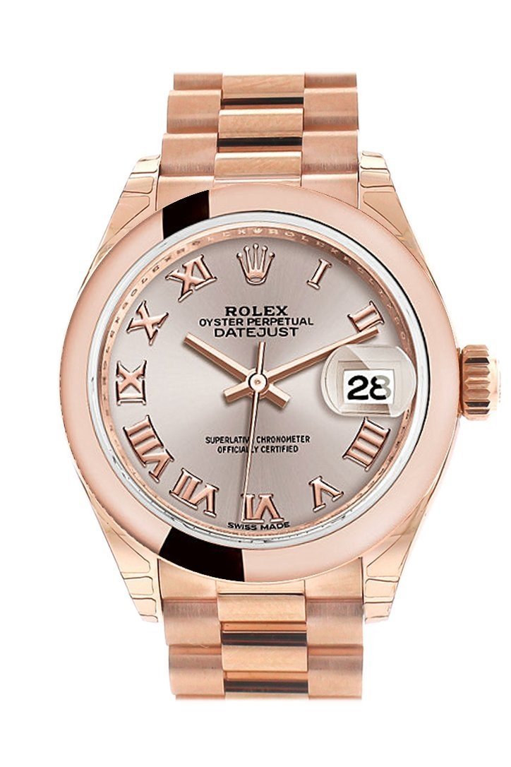 18k everose gold case with a 18k everose gold Rolex President bracelet. Fixed - domed 18k everose gold bezel. Sundust dial with rose-gold tone hands and Roman hour markers. Minute markers around the outer rim. Dial Type: Analog. Date display at the 3 o'clock position. Automatic movement. Scratch resistant sapphire crystal. Screw down crown. Solid case back. Case diameter: 28 mm. Round case shape. Concealed Crown clasp. Water resistant at 100 meters / 330 feet. Functions: date, hour, minute, second. Luxury watch style. Watch label: Swiss Made. Rolex Lady-Datejust 28 Sundust Dial 18K Everose Gold President Automatic Ladies Watch 279165