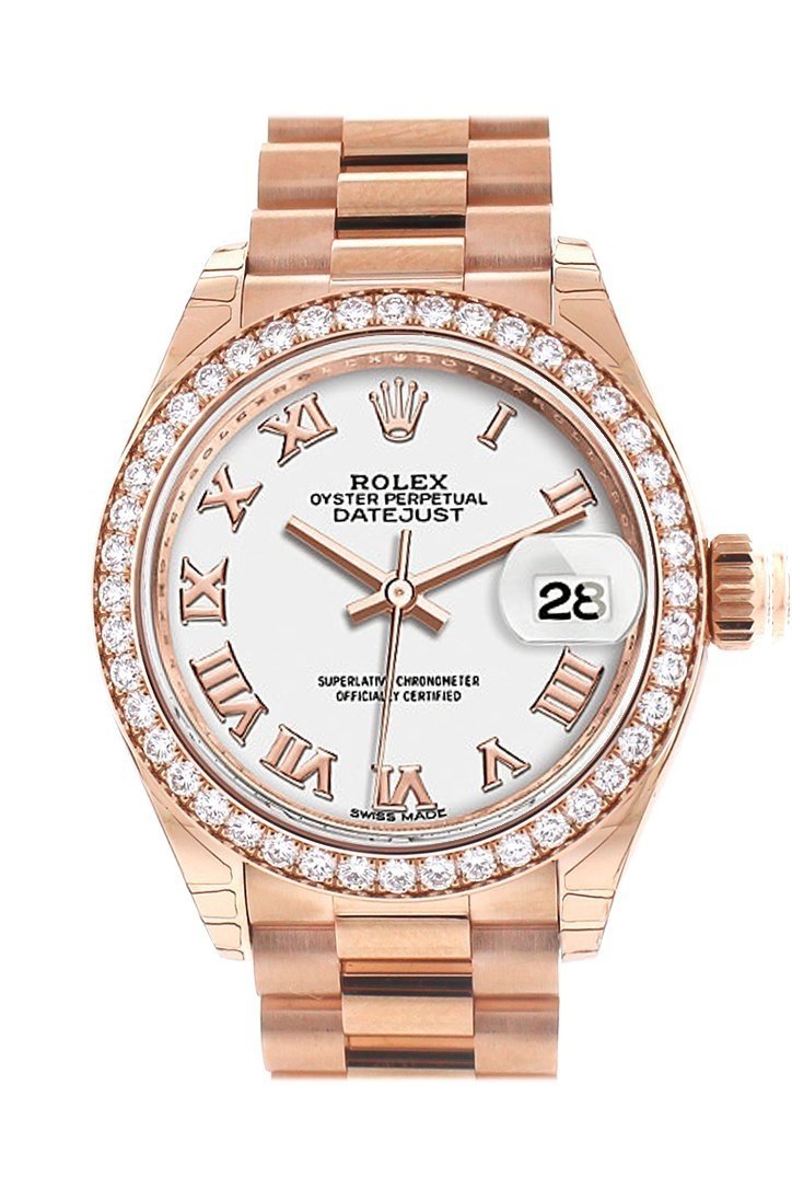 Rolex Datejust 28 White Roman Dial Diamond Bezel Rose Gold President Ladies Watch 279135RBR NP