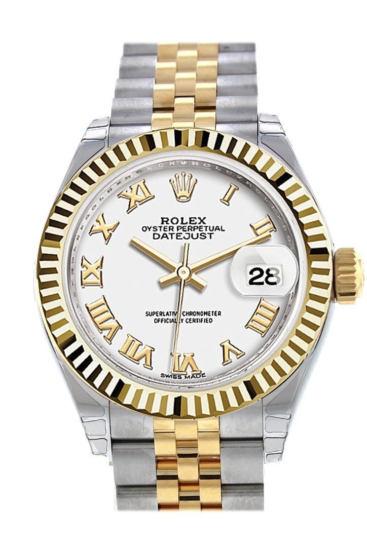 Stainless steel case with a stainless steel and 18kt yellow gold Rolex jubilee bracelet. Fixed fluted 18kt yellow gold bezel. White dial with luminous yellow gold-tone hands and Roman hour markers. Minute markers around the outer rim. Dial Type: Analog. Luminescent hands and markers. Date display at the 3 o'clock position. Rolex calibre 2236 automatic movement with a 55-hour power reserve. Scratch resistant sapphire crystal. Screw down crown. Solid case back. Case size: 28 mm. Round case shape. Concealed crown clasp. Water resistant at 100 meters / 330 feet. Functions: date, hour, minute, second. Luxury watch style. Watch label: Swiss Made. Rolex Lady Datejust White Dial Steel and 18K Yellow Gold Automatic Watch 279173