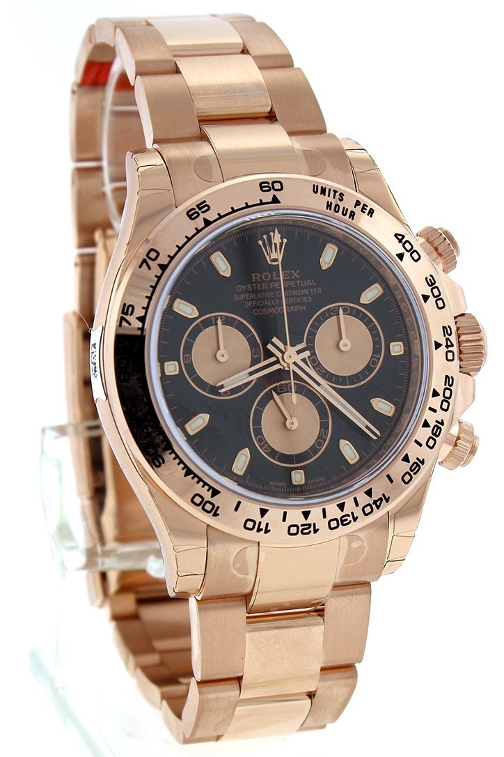 18kt everose gold case with a 18kt everose gold Rolex oyster bracelet. Fixed 18kt everose gold bezel. Black dial with rose gold hands and luminous stick hour markers. Minute markers around the outer rim. Dial Type: Analog. Luminescent hands and dial markers. Chronograph - three sub-dials displaying: 60 second, 30 minute and 12 hour. Automatic movement with a 72 hour power reserve. Scratch resistant sapphire crystal. Screw down crown. Solid case back. Case diameter: 40 mm. Round case shape. Deployment clasp. Water resistant at 100 meters / 330 feet. Functions: Chronograph, Hour, Minute, Second. Luxury watch style. Watch label: Swiss Made. Item Variations: 116505, 116505-BKSO, Rolex-116505, Rolex-116505-BKSO. Rolex Cosmograph Daytona Black Dial 18K Everose Gold Rolex Oyster Automatic Mens Watch 116505