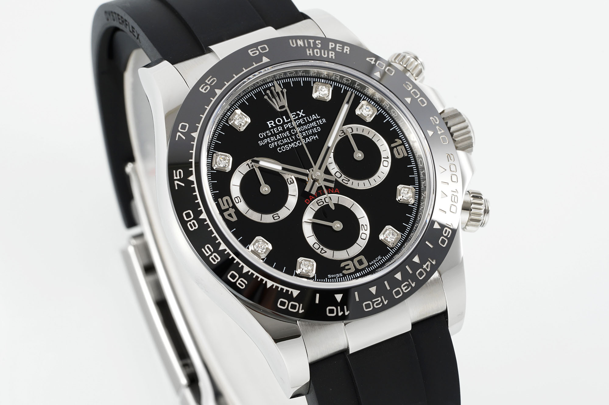 The case is crafted entirely from 18KT white gold with a high-polish finish. It has a black Oysterflex band with a solid 18KT white gold folding oysterlock buckle. This men's Rolex is the epitome of success and high-class. A gloss black dial with diamond hour markers and black/gold subdials offers a handsome contrast against the lustrous white gold finish. Despite its luxurious design, the Daytona is a racer’s watch through and through. The case is built tough, offering resistance to the extreme temperatures and shocks experienced while taking part in endurance races. The case also offers a Rolex calibre 4130 self-winding automatic COSC superlative chronometer certified perpetual movement, complete with anti-shock technology and stopwatch functions.