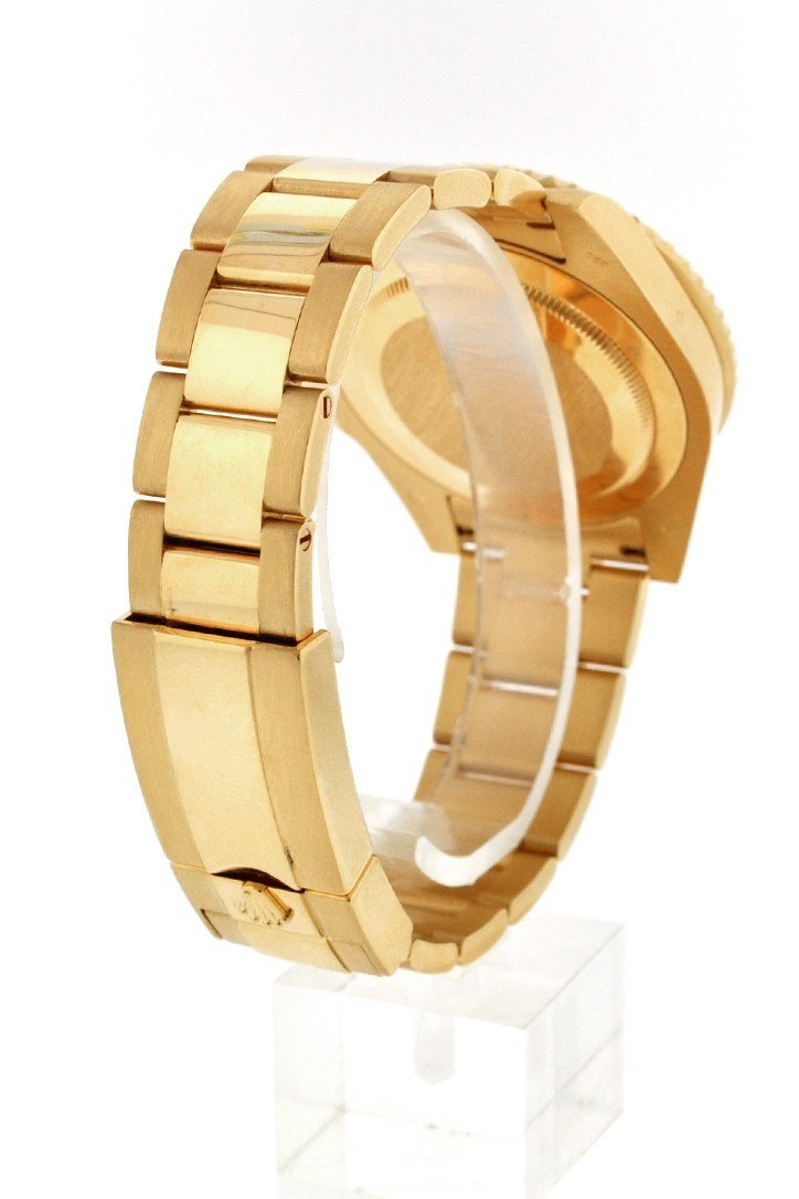 18kt yellow gold case with a 18kt yellow gold oyster bracelet. Bidirectional rotating black bezel with 24 hour markings. Black dial with luminous hands and luminous dot hour markers. Minute markers around the outer rim. Dial Type: Analog. Luminescent hands and dial markers. Date display at the 3 o'clock position. Automatic movement. Scratch resistant sapphire crystal. Solid case back. Case diameter: 40mm. Case thickness: 12mm. Round case shape. Deployment clasp. Water resistant at 100 meters/ 330 feet. Functions: hours/ minutes/ seconds/ date. Luxury watch style. Watch label: Swiss Made. Item Variations: 116718, 116718-BKSO , Rolex-116718, Rolex-116718-BKSO 116718, 116718-BKSO, Rolex. Rolex GMT Master II Black Index Dial Oyster Bracelet 18kt Yellow Gold Mens Watch 116718