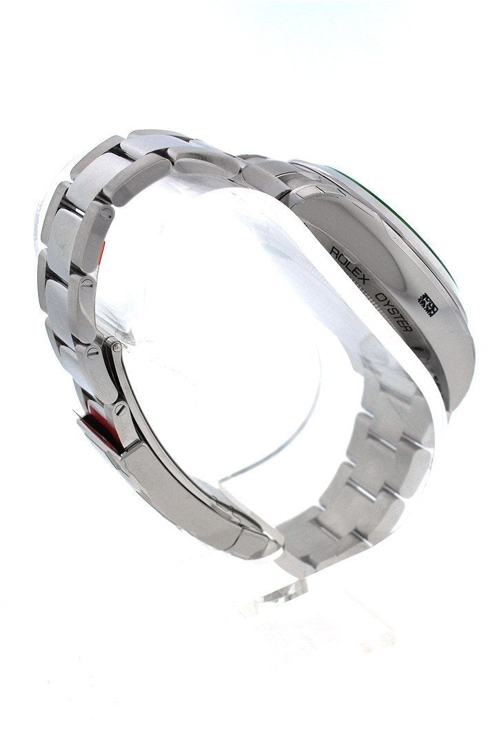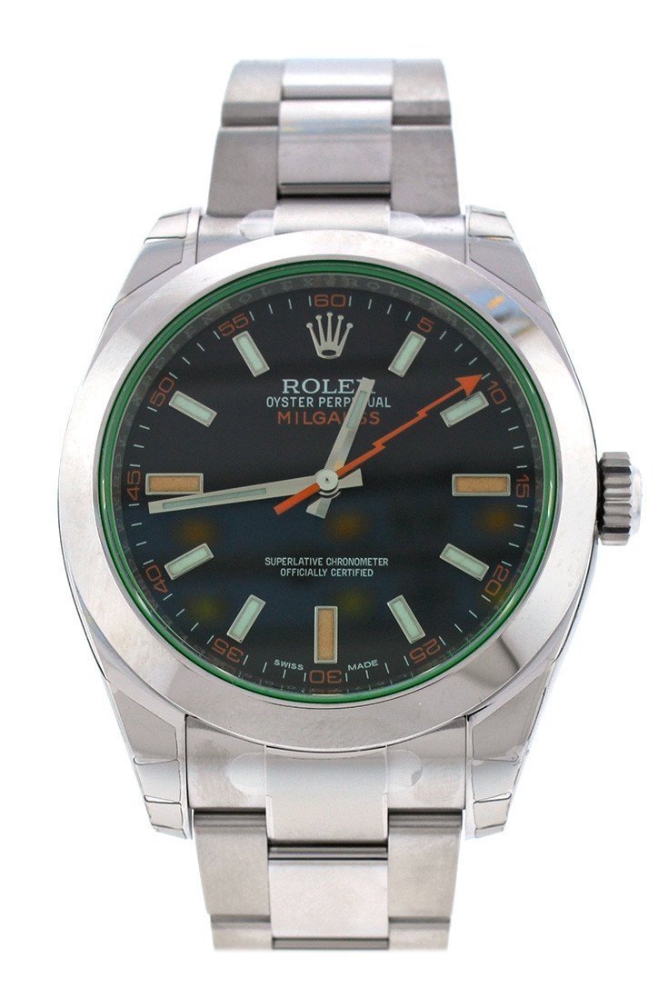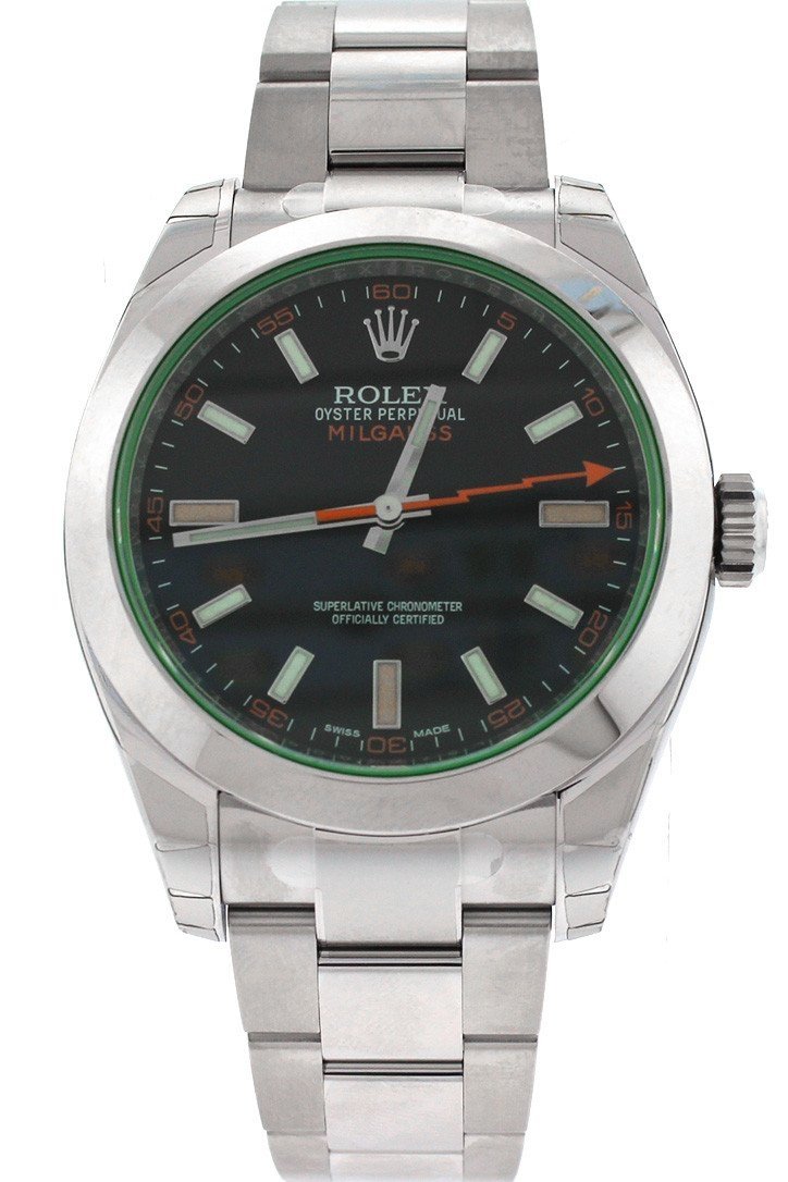 Stainless steel case with a stainless steel Rolex Oyster bracelet. Fixed, domed stainless steel bezel. Black dial with luminous hands and luminous stick hour markers. Minute markers around the outer rim. Dial Type: Analog. Luminescent hands and dial markers. Rolex Calibre 3131 automatic movement with about 48 hours of power reserve. Scratch resistant green sapphire crystal crystal. Solid case back. Case size: 40 mm. Round case shape. Deployment clasp. Water resistant at 100 meters / 330 feet. Functions: hours, minutes, seconds. Additional Info: orange lightning bolt second hand; resistant to magnetic flux density of 1,000 gauss. Luxury watch style. Watch label: Swiss Made. Item Variations: 116400GV, 116400-V, Rolex-116400, Rolex-116400-V. Rolex Milgauss Black Dial Domed Bezel Green Crystal Oyster Bracelet Unisex Watch 116400V.