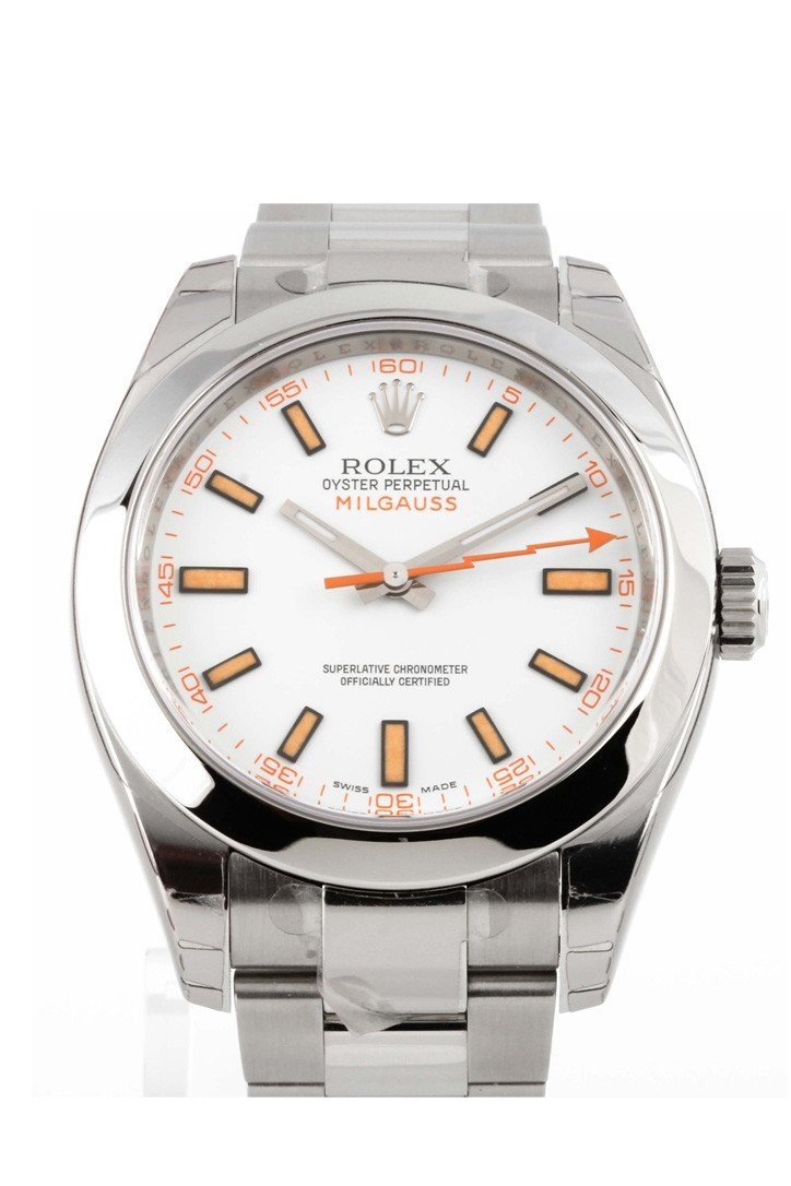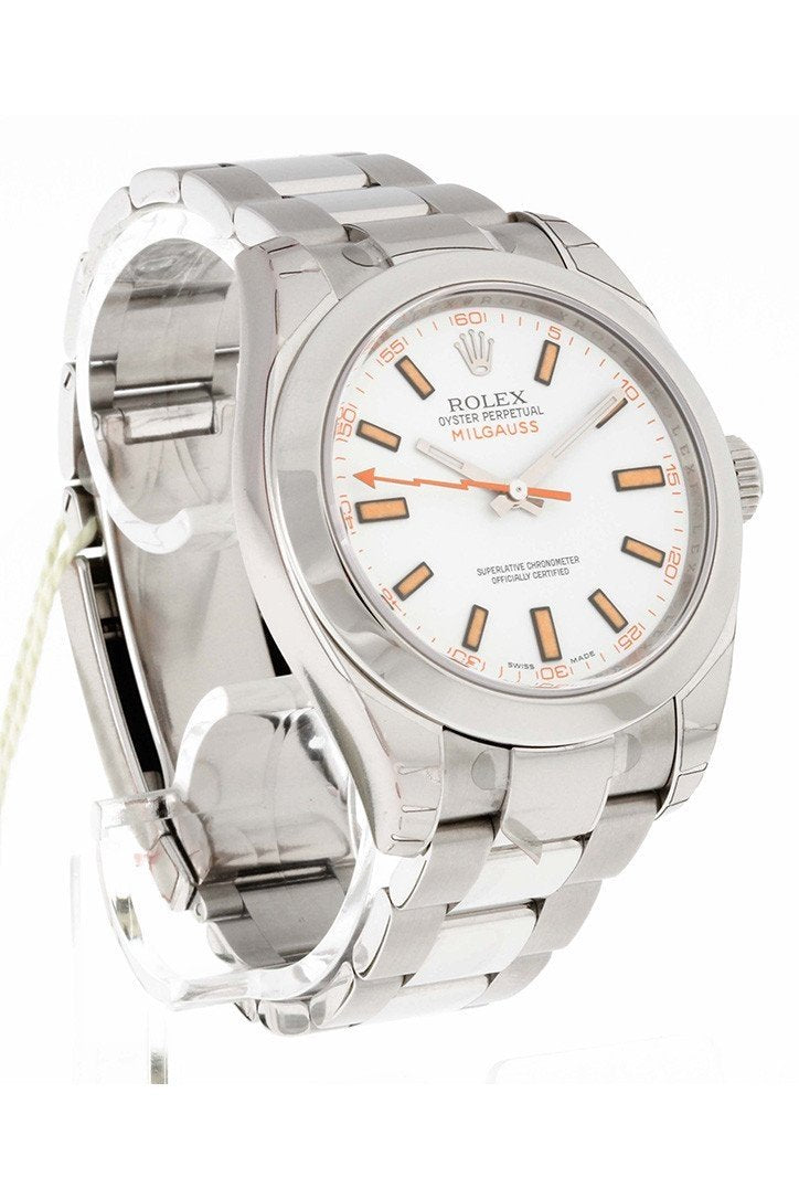Stainless steel case with a stainless steel oyster bracelet. Fixed, domed bezel bezel. White dial with luminous hands and luminous stick hour markers. Minute markers around the outer edge. Luminescent hands and dial markers. Automatic movement. Scratch resistant sapphire crystal. Case diameter: 40mm. Deployment clasp. Water resistant at 100 meters / 330 feet. AdditionalInfo: orange lightning bolt second hand; resistant to magnetic flux density of 1,000 gauss. Rolex Milgauss White Index Dial Domed Bezel Oyster Bracelet Mens Watch 116400