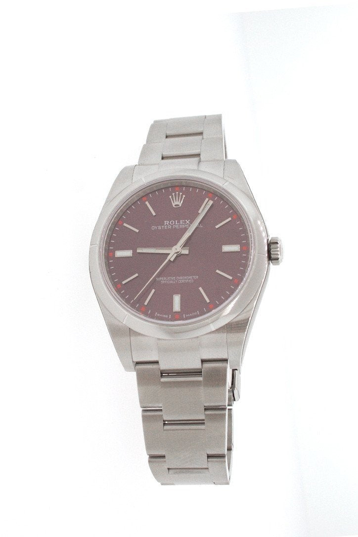 Stainless steel case with a stainless steel oyster bracelet. Fixed bezel. Red grape dial with luminous hands and index hour markers. Minute markers around the outer rim. Dial Type: Analog. Automatic movement. Scratch resistant sapphire crystal. Screw down crown. Case diameter: 39 mm. Round case shape. Oysterlock clasp. Water resistant at 100 meters / 330 feet. Functions: hour, minute, second. Luxury watch style. Watch label: Swiss Made. Rolex Oyster Perpetual Red Grape Dial Stainless Steel Mens Watch. 114300