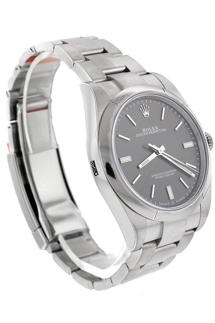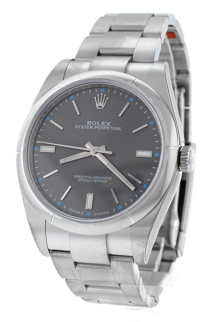 Stainless steel case with a stainless steel rolex oyster bracelet. Fixed domed stainless steel bezel. Dark rhodium dial with silver-tone hands and index hour markers. Minute markers around the outer rim. Dial Type: Analog. Luminescent hands and markers. Automatic movement. Scratch resistant sapphire crystal. Screw down crown. Case diameter: 39 mm. Round case shape. Oysterlock clasp. Water resistant at 100 meters / 330 feet. Functions: hour, minute, second. Luxury watch style. Watch label: Swiss Made. Rolex Oyster Perpetual 39 Dark Rhodium Dial Stainless Steel Rolex Oyster Automatic Mens Watch. 114300
