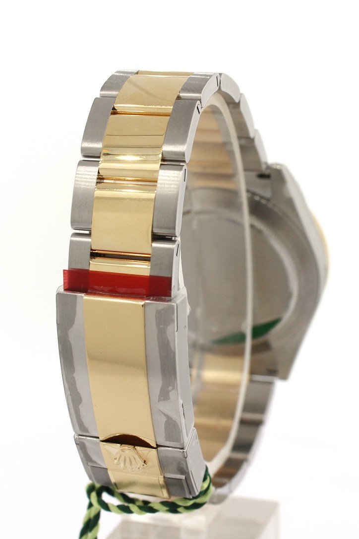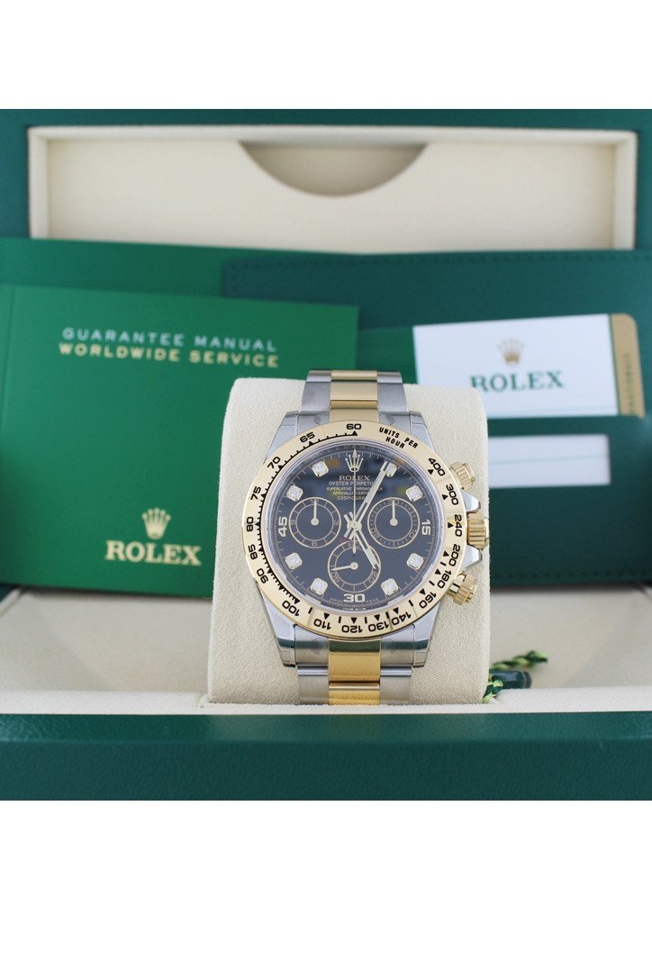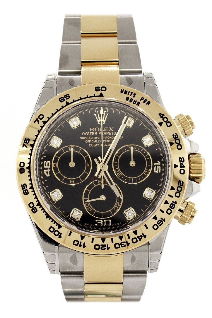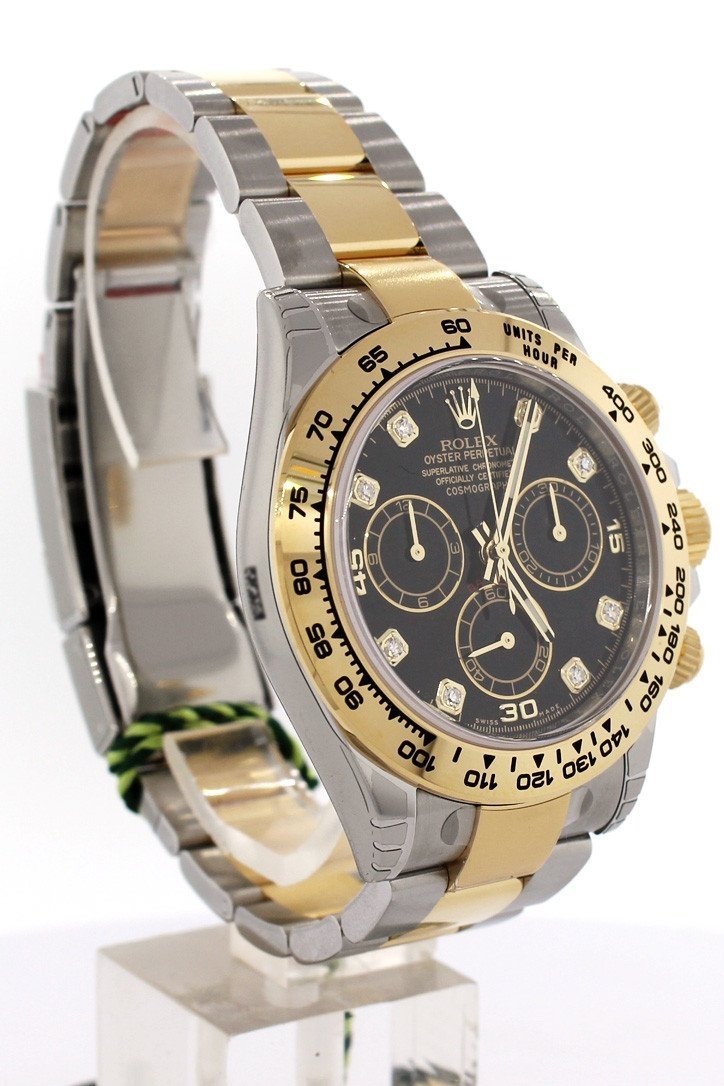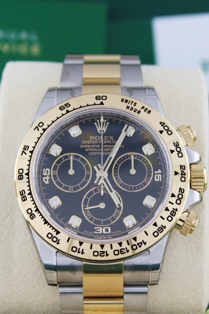 Stainless steel and 18k yellow gold case with a stainless steel and 18k yellow gold Rolex Oyster bracelet. Fixed bezel. Black dial with gold-tone hands and diamond hour markers. Minute markers around the outer rim. Dial Type: Analog. Chronograph - sub-dials displaying: three - 60 second, 30 minute and 12 hour. Rolex Calibre 4130 automatic movement. Scratch resistant sapphire crystal. Screw down crown. Solid case back. Case size: 40 mm. Round case shape. Oysterlock clasp. Water resistant at 100 meters / 330 feet. Functions: chronograph, hour, minute, second. Luxury watch style. Watch label: Swiss Made. Rolex Cosmograph Daytona Black Diamond Dial Steel and 18K Yellow Gold Mens Watch 116503