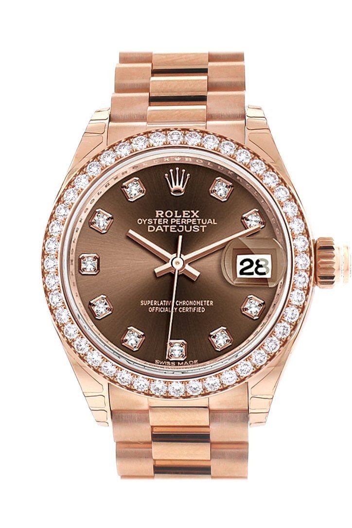 Stainless steel case with a stainless steel and 18kt everose gold Rolex oyster President. Fixed fluted 18kt everose gold bezel. Chocolate dial with everose gold-tone hands and Diamond hour markers. Dial Type: Analog. Date display at the 3 o'clock position. Rolex calibre 2236 automatic movement with a 55-hour power reserve. Scratch resistant sapphire crystal. Screw down crown. Solid case back. Case size: 28 mm. Round case shape. Oysterlock clasp. Water resistant at 100 meters / 330 feet. Functions: date, hour, minute, second, chronometer. Luxury watch style. Watch label: Swiss Made. Rolex Lady Datejust Chocolate Dial Automatic Ladies Watch 279135RBR