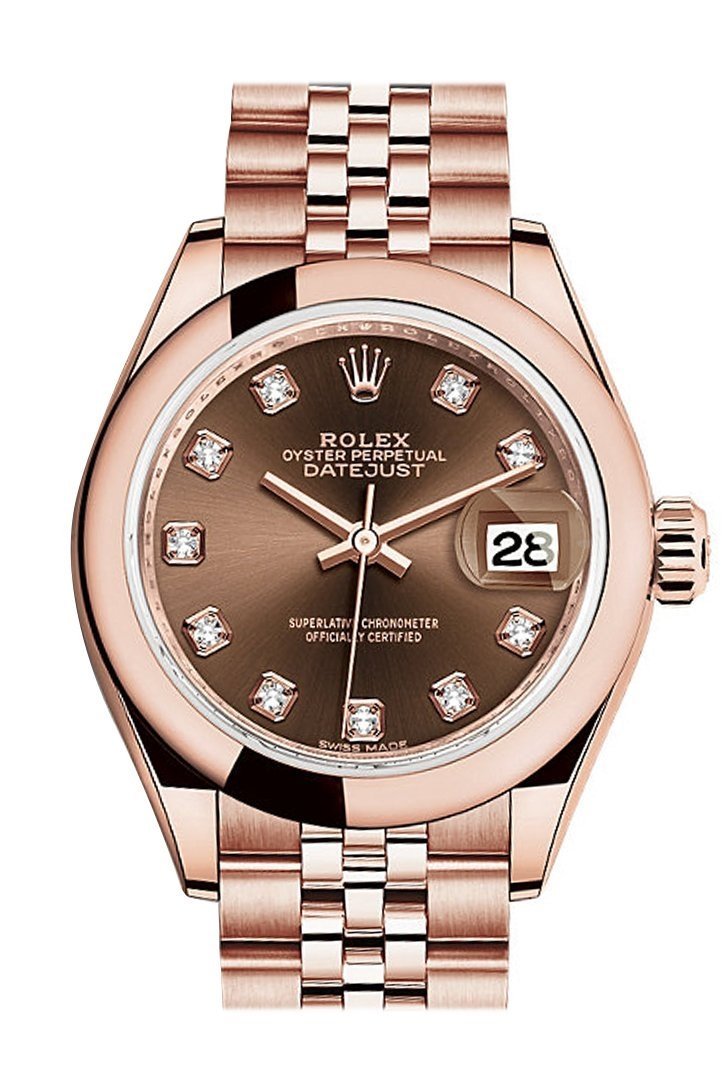 18k everose gold case with a 18k everose gold Rolex Jubilee bracelet. Fixed - domed 18k everose gold bezel. Chocolate dial with rose-gold tone hands and Diamond hour markers. Minute markers around the outer rim. Dial Type: Analog. Date display at the 3 o'clock position. Automatic movement. Scratch resistant sapphire crystal. Screw down crown. Solid case back. Case diameter: 28 mm. Round case shape. Concealed Crown clasp. Water resistant at 100 meters / 330 feet. Functions: date, hour, minute, second. Luxury watch style. Watch label: Swiss Made. Rolex Lady-Datejust 28 Chocolate Dial 18K Everose Gold Jubilee Automatic Ladies Watch 279165