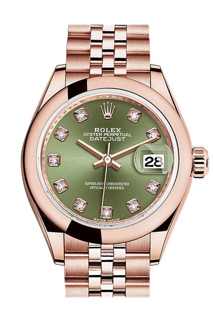 18k everose gold case with a 18k everose gold Rolex Jubilee bracelet. Fixed - domed 18k everose gold bezel. Olive Green dial with rose-gold tone hands and Diamond hour markers. Minute markers around the outer rim. Dial Type: Analog. Date display at the 3 o'clock position. Automatic movement. Scratch resistant sapphire crystal. Screw down crown. Solid case back. Case diameter: 28 mm. Round case shape. Concealed Crown clasp. Water resistant at 100 meters / 330 feet. Functions: date, hour, minute, second. Luxury watch style. Watch label: Swiss Made. Rolex Lady-Datejust 28 Olive Green Dial 18K Everose Gold Jubilee Automatic Ladies Watch 279165