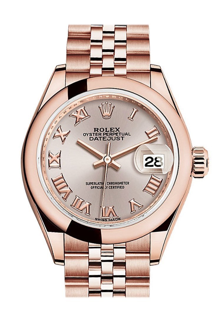 18k everose gold case with a 18k everose gold Rolex Jubilee bracelet. Fixed - domed 18k everose gold bezel. Sundust dial with rose-gold tone hands and Roman hour markers. Minute markers around the outer rim. Dial Type: Analog. Date display at the 3 o'clock position. Automatic movement. Scratch resistant sapphire crystal. Screw down crown. Solid case back. Case diameter: 28 mm. Round case shape. Concealed Crown clasp. Water resistant at 100 meters / 330 feet. Functions: date, hour, minute, second. Luxury watch style. Watch label: Swiss Made. Rolex Lady-Datejust 28 Sundust Dial 18K Everose Gold Jubilee Automatic Ladies Watch 279165