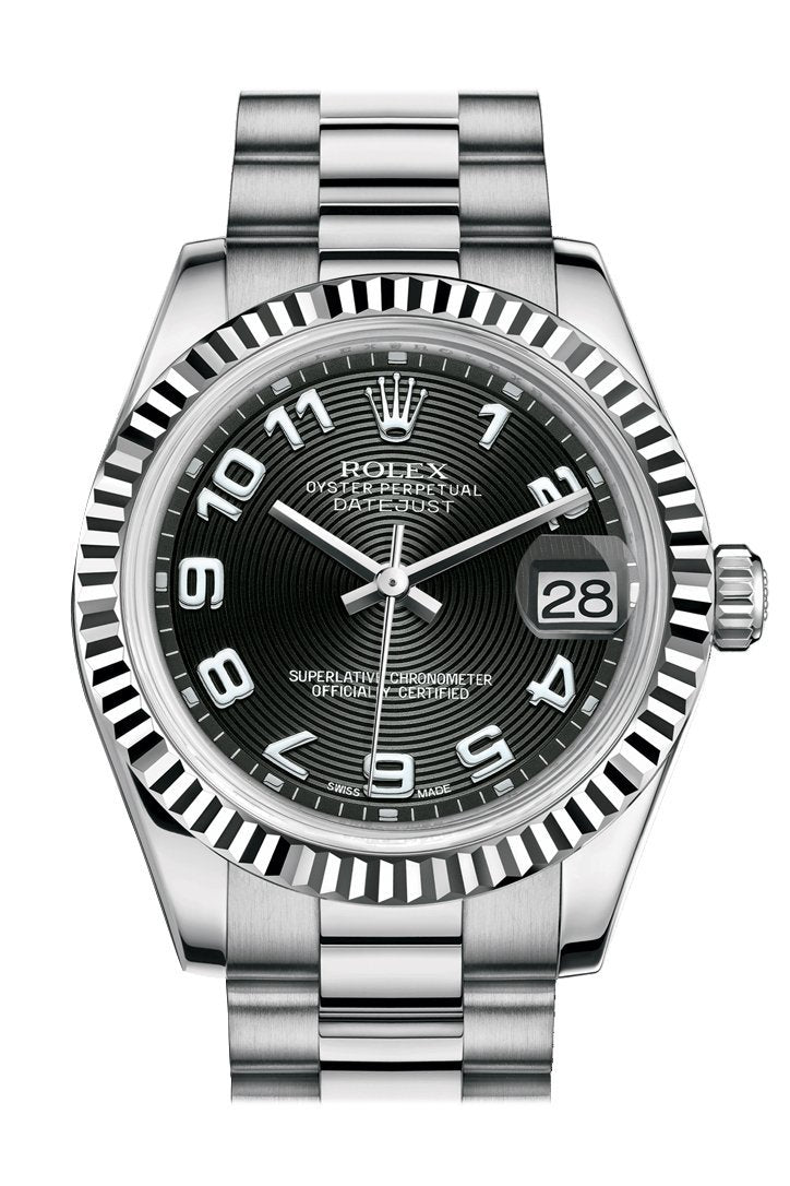 Rolex Datejust 31 Black Concentric Circles Arabic Dial Fluted Bezel 18K White Gold President Ladies Watch 178279