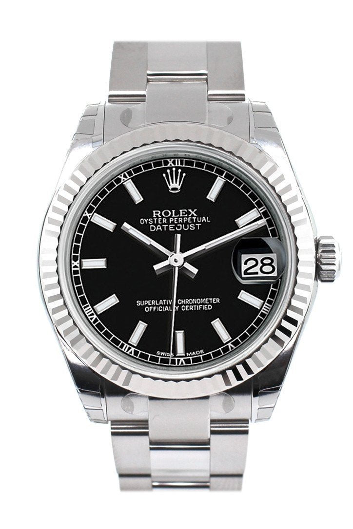 Stainless steel case with a stainless steel bracelet. Fluted bezel. Black dial with silver-tone hands and index hour markers. Minute markers around the outer rim. Dial Type: Analog. Luminescent hands and markers. Date display at the 3 o'clock position. Automatic movement. Scratch resistant sapphire crystal. Screw down crown. Solid case back. Case diameter: 31mm. Oysterclasp clasp. Water resistant at 100 meters / 330 feet. Functions: date, hour, minute, second. Casual watch style. Watch label: Swiss Made. Rolex Datejust Black Dial Automatic Stainless Steel Ladies Watch 178274