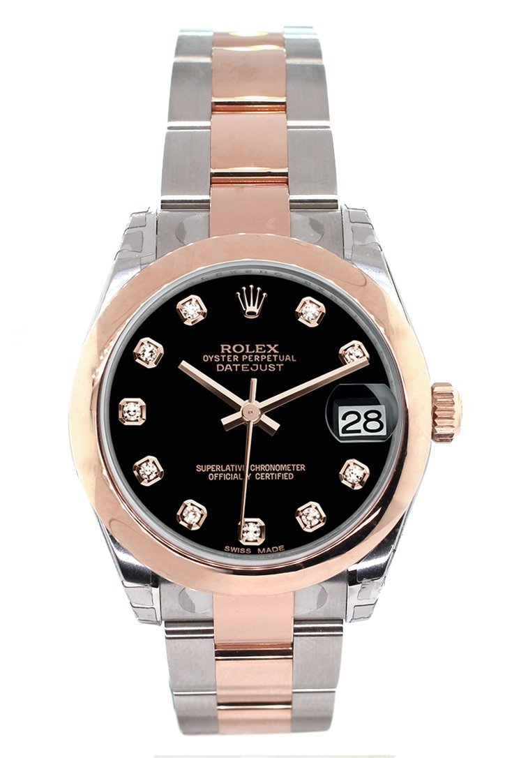 Everose gold case with a oyster everose gold bracelet. Domed bezel. Black dial with rose gold-tone hands and Diamond hour markers. Dial Type: Analog. Date display at the 3 o'clock position. Automatic movement. 2235 engine. Scratch resistant sapphire crystal. Screw down crown. Solid case back. Case diameter: 31 mm. Round case shape. Folding oysterclasp clasp. Water resistant at 100 meters / 330 feet. Functions: date, hour, minute, second. Luxury watch style. Watch label: Swiss Made. Rolex Datejust Black Dial 18k Rose Gold Automatic Ladies Watch 178241