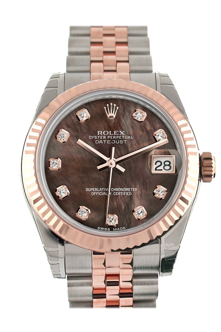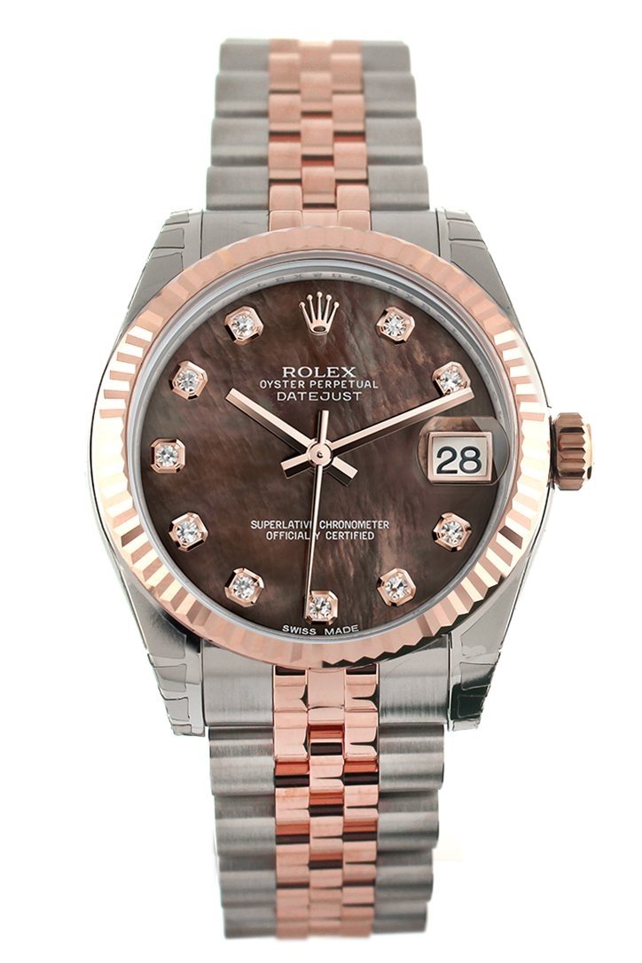 Everose gold case with a Jubilee everose gold bracelet. Fluted bezel. Black Mother Pearl dial with rose gold-tone hands and Diamond hour markers. Dial Type: Analog. Date display at the 3 o'clock position. Automatic movement. 2235 engine. Scratch resistant sapphire crystal. Screw down crown. Solid case back. Case diameter: 31 mm. Round case shape. Folding oysterclasp clasp. Water resistant at 100 meters / 330 feet. Functions: date, hour, minute, second. Luxury watch style. Watch label: Swiss Made.