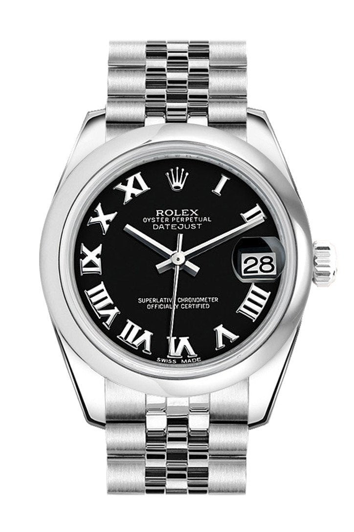 Stainless steel case with a stainless steel bracelet. Domed bezel. Black dial with silver-tone hands and index hour markers. Minute markers around the outer rim. Dial Type: Analog. Luminescent hands and markers. Date display at the 3 o'clock position. Automatic movement. Scratch resistant sapphire crystal. Screw down crown. Solid case back. Case diameter: 31 mm. Round case shape. Concealed crown clasp. Water resistant at 100 meters / 330 feet. Functions: date, hour, minute, second. Luxury watch style. Watch label: Swiss Made. Rolex Datejust Lady 31 Black Dial Stainless Steel Automatic Ladies Watch 178240