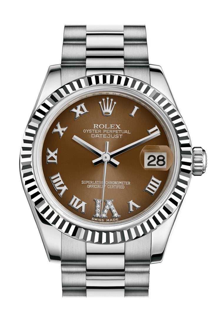 18k White gold case with a 18k White gold Rolex President bracelet. Fixed - fluted 18kWhite gold bezel. Bronze dial with rose-gold tone hands and Roman numeral hour markers. Dial Type: Analog. Date display at the 3 o'clock position. Automatic movement. 2235 engine. Scratch resistant sapphire crystal. Screw down crown. Solid case back. Case diameter: 31 mm. Round case shape. Concealed Crown clasp. Water resistant at 100 meters / 330 feet. Functions: date, hour, minute, second. Luxury watch style. Watch label: Swiss Made. Rolex Lady-Datejust 31