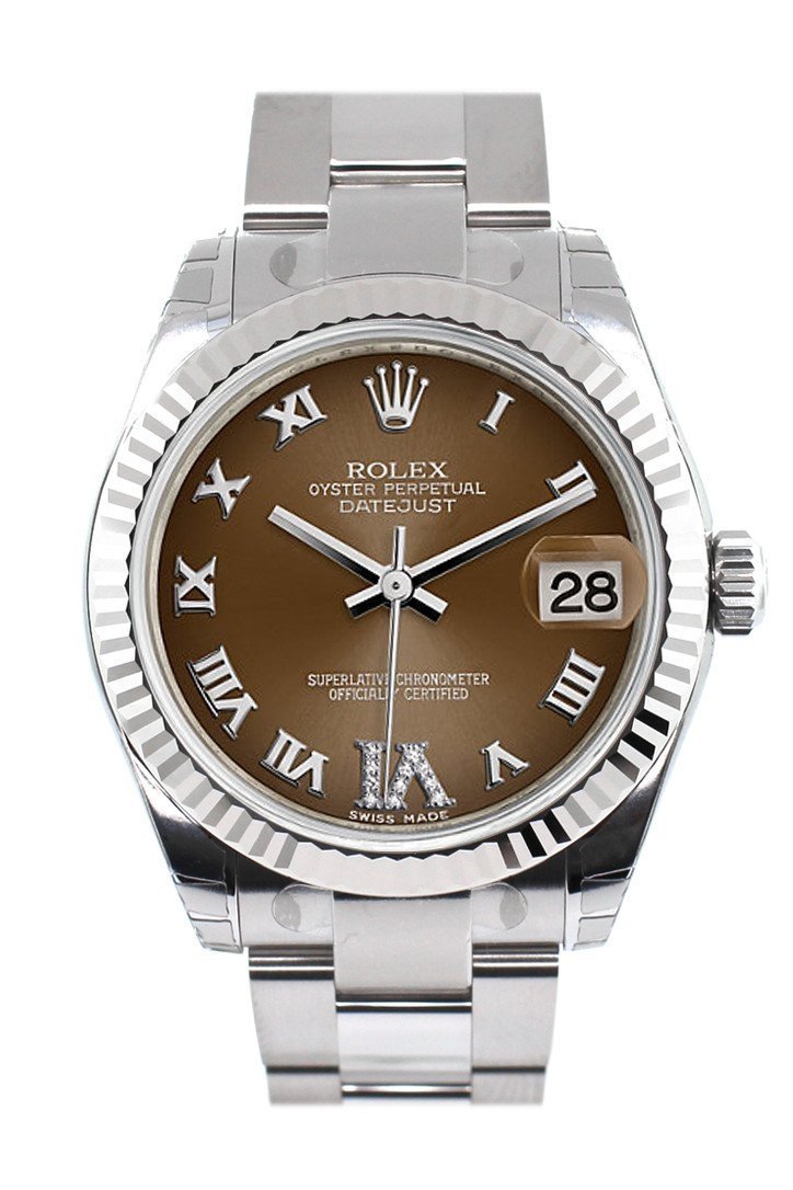 Stainless steel case with a stainless steel Oyster bracelet. Fixed 18kt white gold bezel. Bronze Roman Large VI set with Diamonds dial with white gold hands and Roman numeral hour markers. Diamond-set Roman numeral at 6 o'clock position. Dial Type: Analog. Date display at the 3 o'clock position. Automatic movement. Scratch resistant sapphire crystal. Screw down crown. Solid case back. Case diameter: 31 mm. Case thickness: 11 mm. Round case shape. Fold over clasp. Water resistant at 100 meters / 330 feet. Luxury watch style. Watch label: Swiss Made. Rolex DateJust Bronze Roman Large VI set with Diamonds Dial Stainless Steel Oyster Ladies Watch 178274