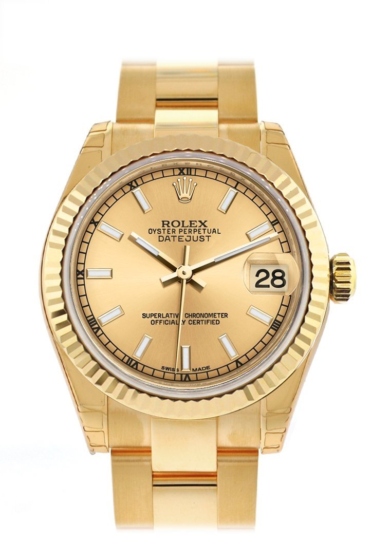 18k gold Fluted bezel. Pink dial with silver hands and Index numeral hour markers. Minute markers around the outer rim. Dial Type: analog. Date display at the 3 o'clock position. Automatic movement. Deployment clasp. Luxury watch style. Rolex Datejust Champagne Dial Automatic 18K Gold Bezel Watch 178278